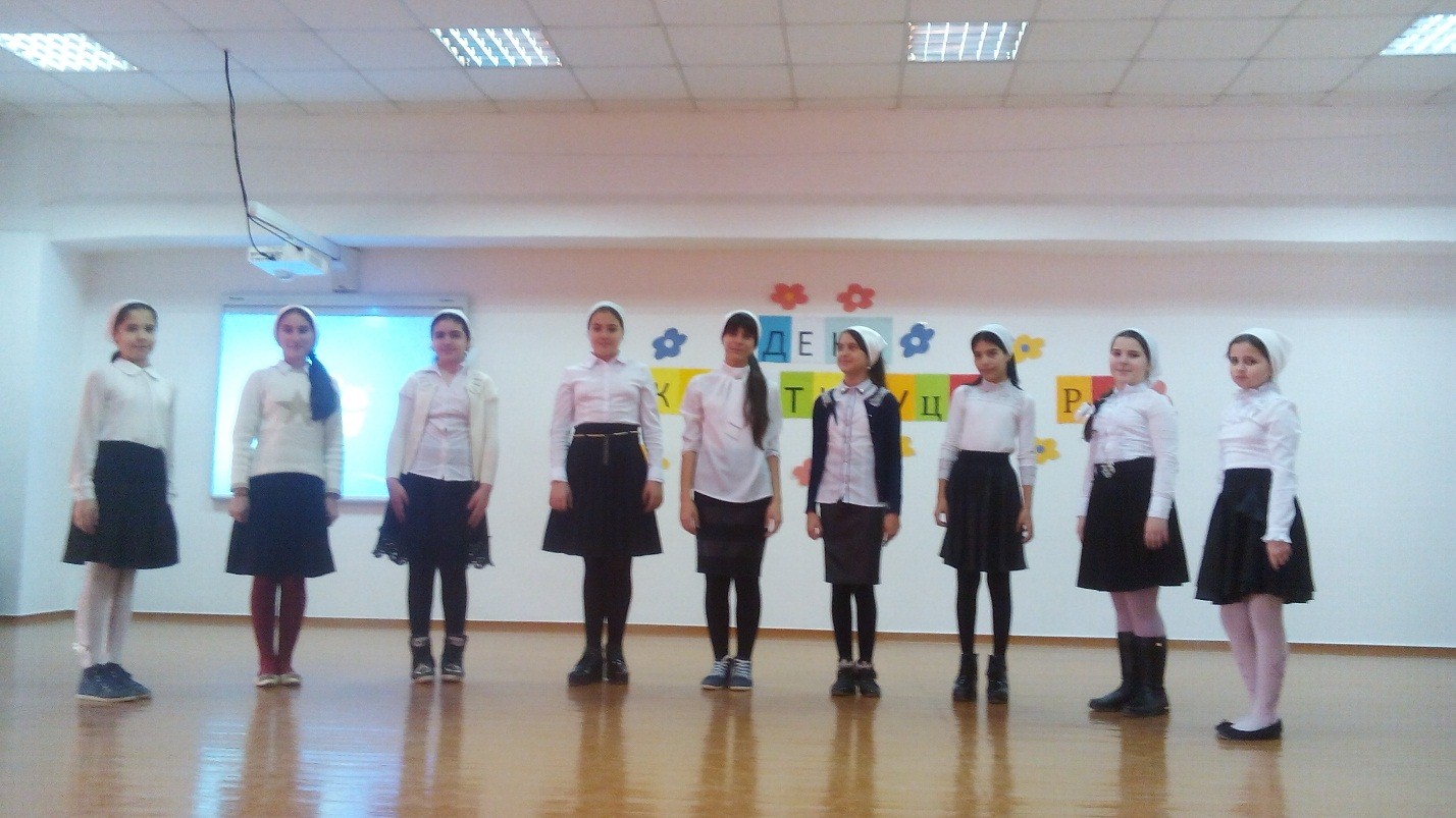 Учащиеся 5-9-х классов подготовили праздничную концертную программу. Дети пели песни, читали стихи. Активное участие приняли в этом мероприятии: ВитаеваАминат(6 «б» кл.), Махаражова Амина (6 «б» кл.), Газакбиева Д.А. (9 «б»кл.)