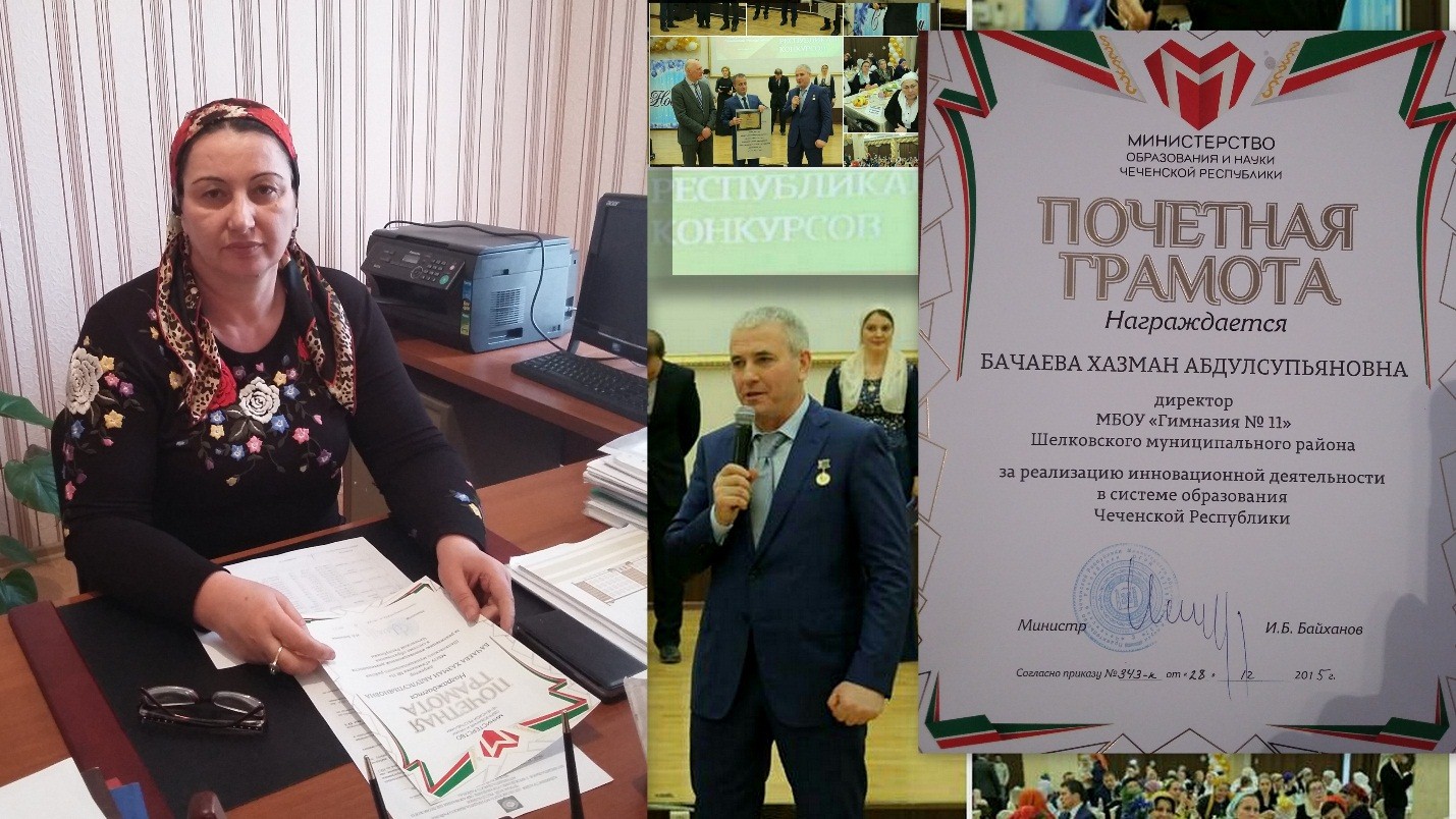 Директор МБОУ «Гимназия №11» Бачаева Хазман Абдулсупьяновна была награждена Почетной грамотой Министерства образования и науки Чеченской Республики за реализацию инновационной деятельности в системе образования Чеченской Республики.