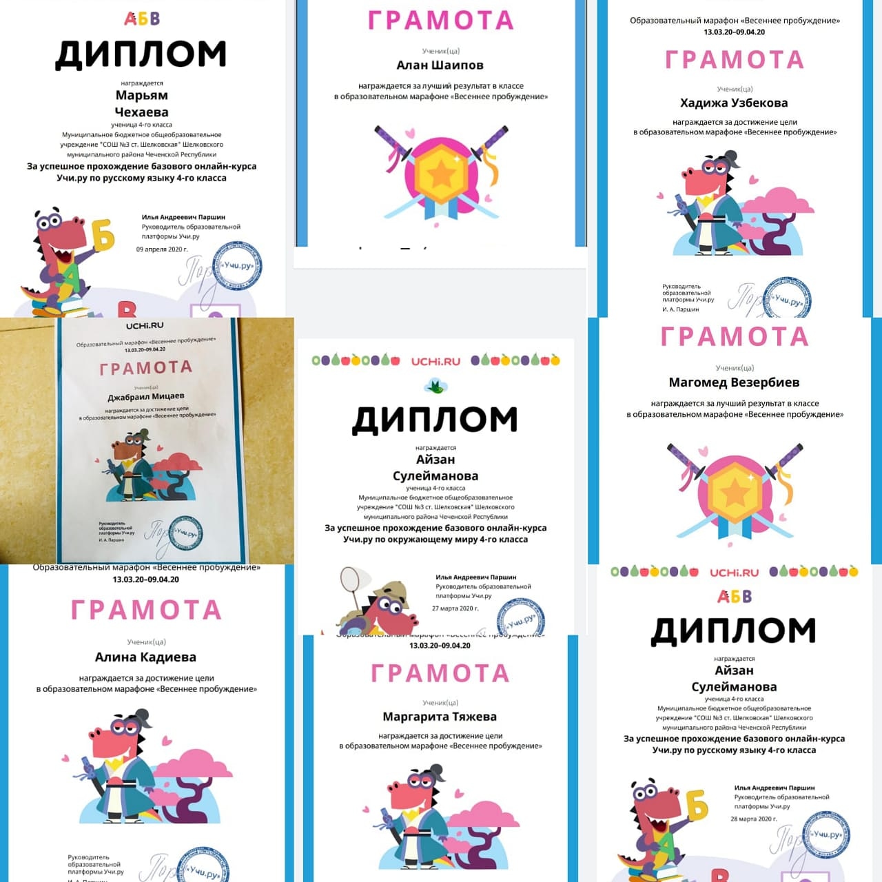 10 апреля 2020 года- результаты работы обучающихся 4 "а" класса МБОУ " СОШ#3 ст.Шелковская" на образовательной платформе Учи.ру.Наши детки вместе с классным руководителем Эльмурзаевой З.Х. принимали участие в образовательном марафоне "Весеннее пробуждение".