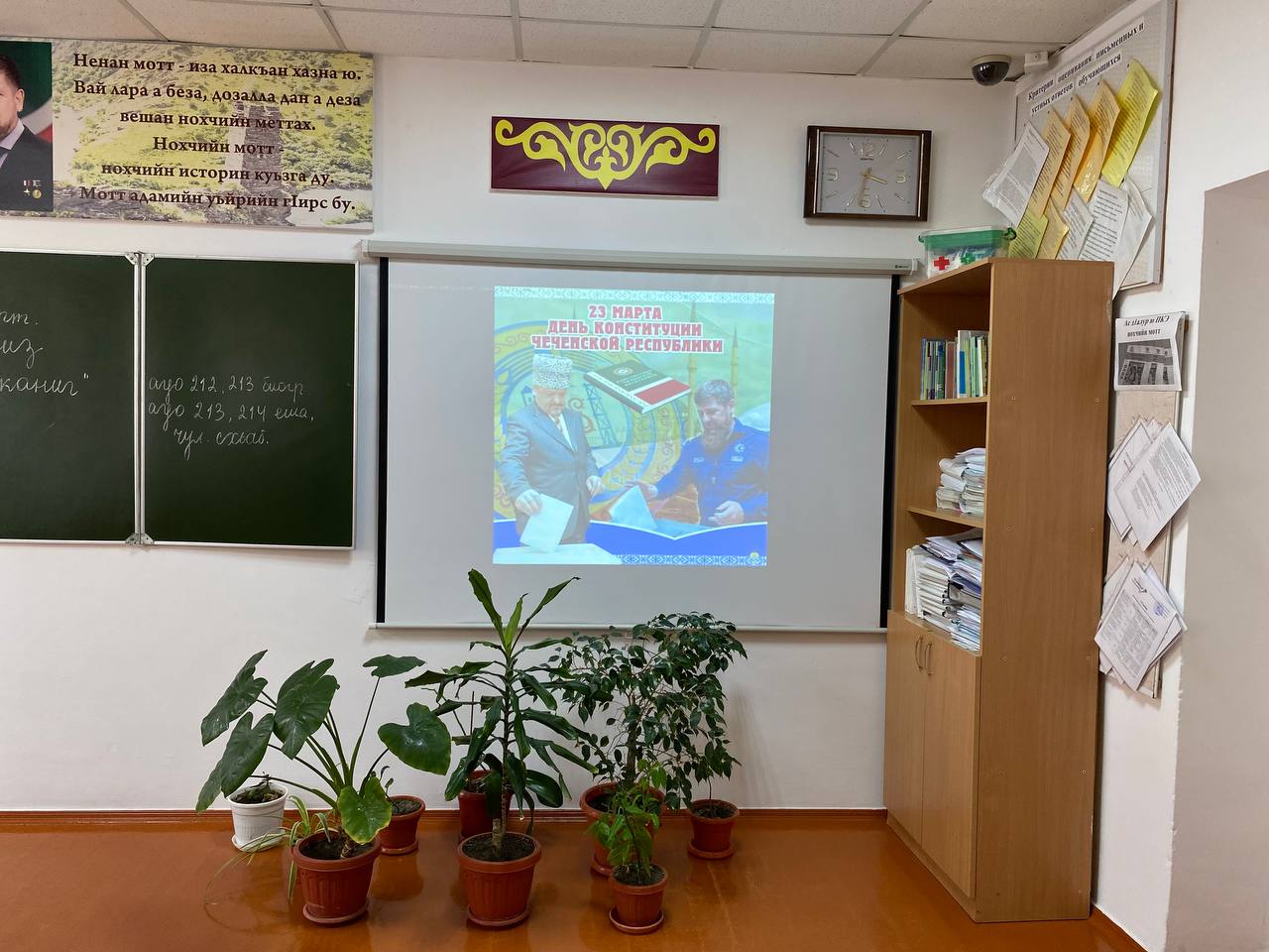 14 марта 2022 года Джабаева Хадижат Имрановна провела классный час в 8Б классе, приуроченный ко Дню Конституции ЧР, принятой на основе всенародного референдума, инициированного и проведенного под непосредственным руководством первого Президента ЧР, Героя России Ахмата-Хаджи Кадырова.
