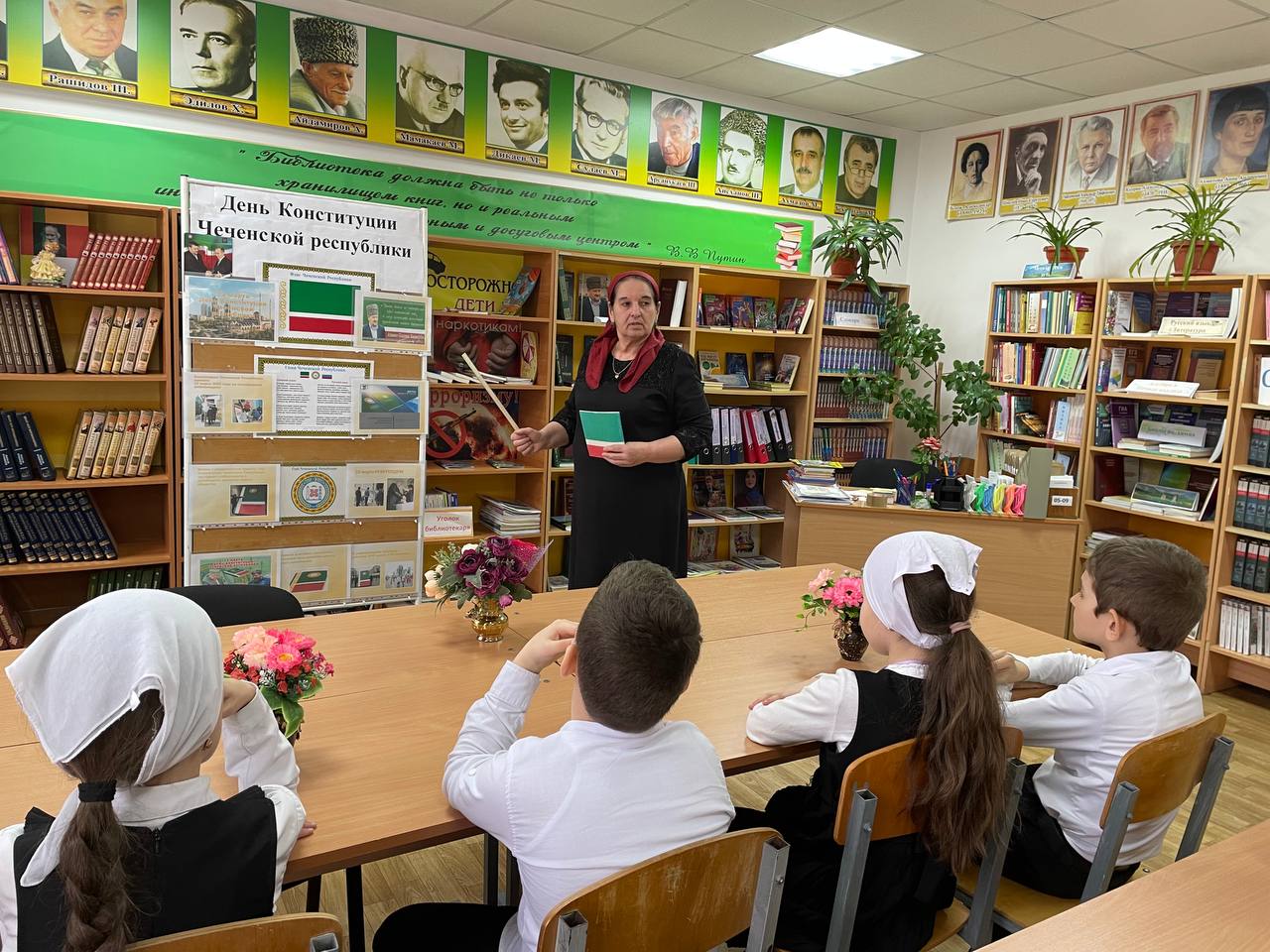17 марта 2022 года Джабаева Масра Абдусупьяновна оформила выставку.Также, для 2Б класса проведён классный час на тему: «Наши законы». Библиотекарь рассказала юным читателям о Конституции нашей республики, о том, что Конституция – это основной закон Чеченской Республики, состоящий из преамбулы, 2 разделов, 9 глав и 112 статей.В ходе беседы особое внимание было уделено роли Первого Президента А-Х. Кадырова в проведении Референдума, на котором 23 марта 2003 года была принята новая Конституция Чеченской Республики.Масра Абусупьяновна сделала обзор книжных выставок «Он ушел непобежденным», посвященный Первому Президенту Чеченской Республики А-Х. Кадырову и «Р.А. Кадыров - глава Чеченской Республики», посвященный главе ЧР. Дети ознакомились с печатной версией Конституции ЧР на русском и чеченском языках.