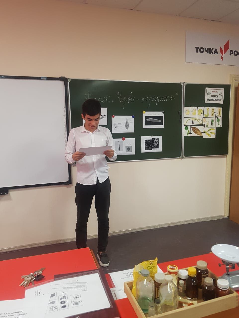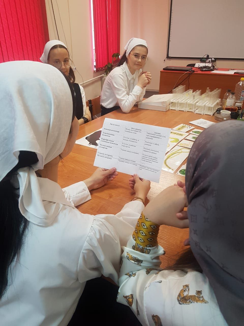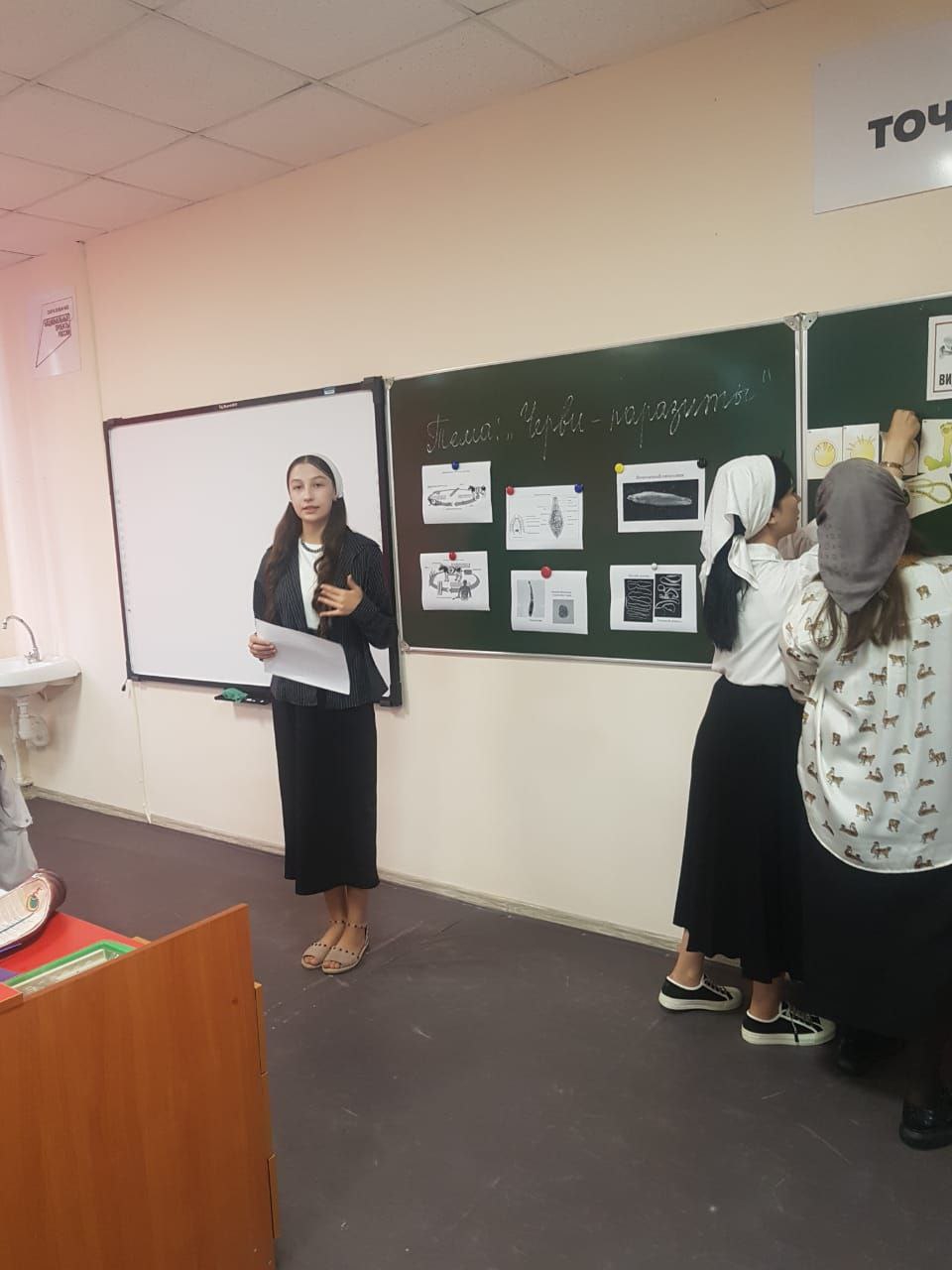 17 мая 2022 года учитель химии и биологии Мавсарова Сияда Алавудиновна в рамках подготовки к ОГЭ с учащимися 9 «а» класса провела урок биологии на тему: «Развитие и размножение паразитических червей» при проведении которого учащиеся, используя презентацию, влажные микропрепараты, таблицы, муляжи, обобщили теоретический материал и закрепили умения решении заданий КИМ ОГЭ №12-17.