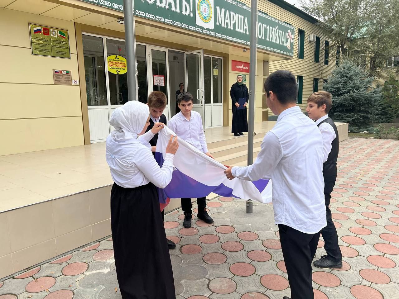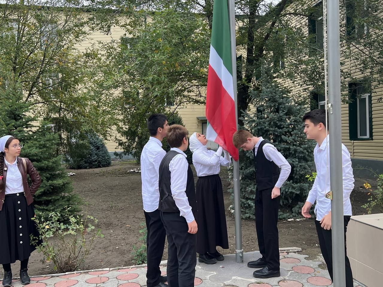 Сегодня понедельник, 24 октября и по доброй традиции новая учебная неделя в нашей школе начинается с поднятия флагов, исполнения гимнов РФ и ЧР, «Разговоров о важном».
