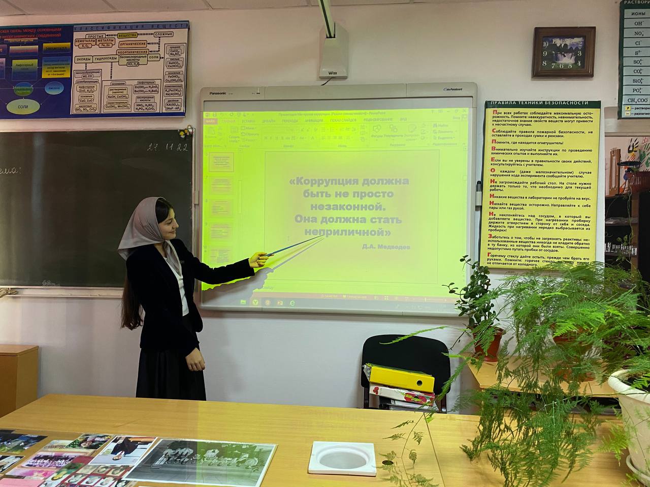 24 ноября 2022 года Мавсарова Сияда Алаудиновна, заместитель директора по МР для учащихся 10 «А» класса провела информационный урок, в целях формирования антикоррупционной культуры по теме: «Мировой опыт борьбы с коррупцией».