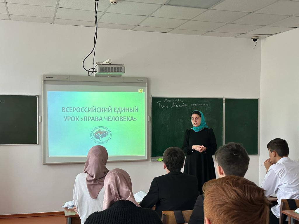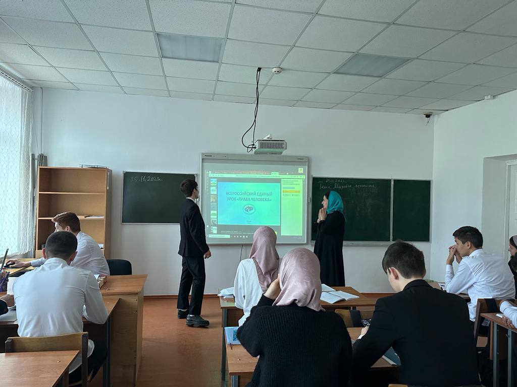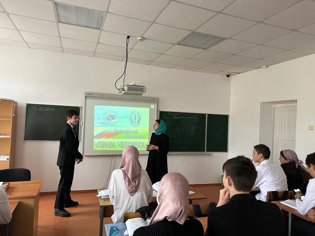 29 ноября 2022 года в рамках проведения масштабной образовательной акции – Всероссийский единый урок «Права человека» Хамдиевой Ренатой Хасановной, учителем обществознания МБОУ «Шелковская СОШ N3» проведен урок в 11 «А» классе на тему: «Права человека», приуроченный к Международному дню прав человека и 25-летию подписания Федерального конституционного закона от 26 февраля 1997 года № 1-ФКЗ «Об уполномоченном по правам человека в Российской Федерации», а также проведения всероссийского Дня правовой помощи детям.