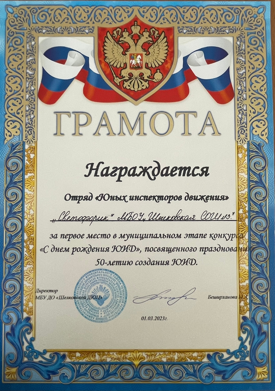 🚦1 марта 2023 года, в преддверии праздника, посвященного 50-летию образования ЮИД в РДК Шелковского муниципального районного был проведен конкурс «С днем рождения ЮИД» среди школьных команд Шелковского района, в котором приняла участие и команда ЮИД «Светофорик» МБОУ «Шелковская СОШ №3» под руководством заместителя директора по ВР Гаибовой Аминат Алхазуровны.