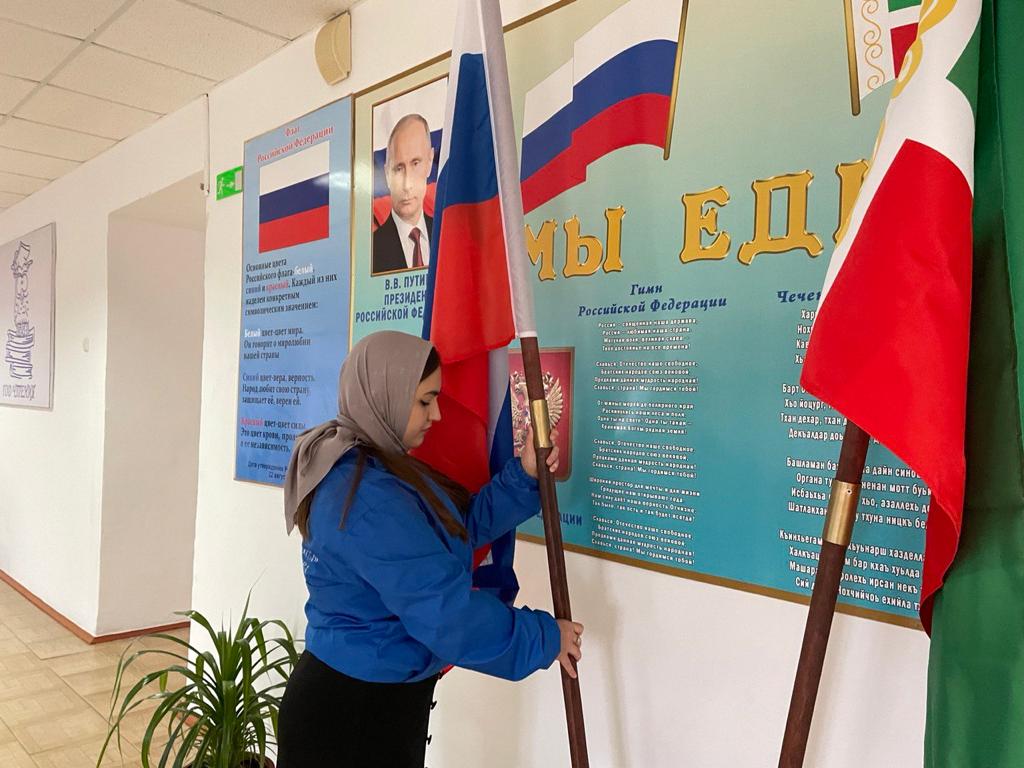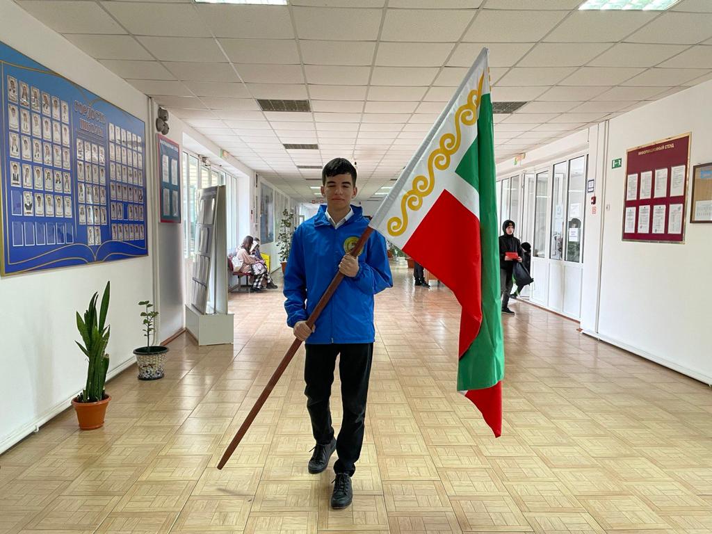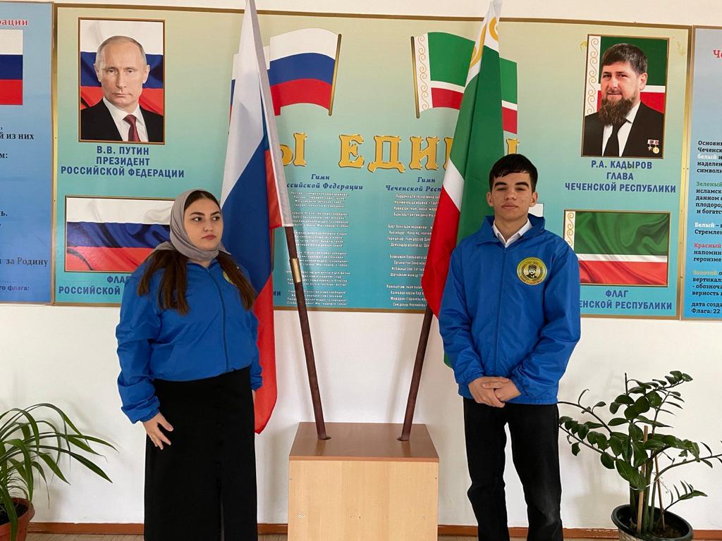Почетное право поднять Государственные флаги РФ и ЧР предоставлено обучающимся 10-А класса Геримовой Мадине и Муциеву Мохмад-Аламу.