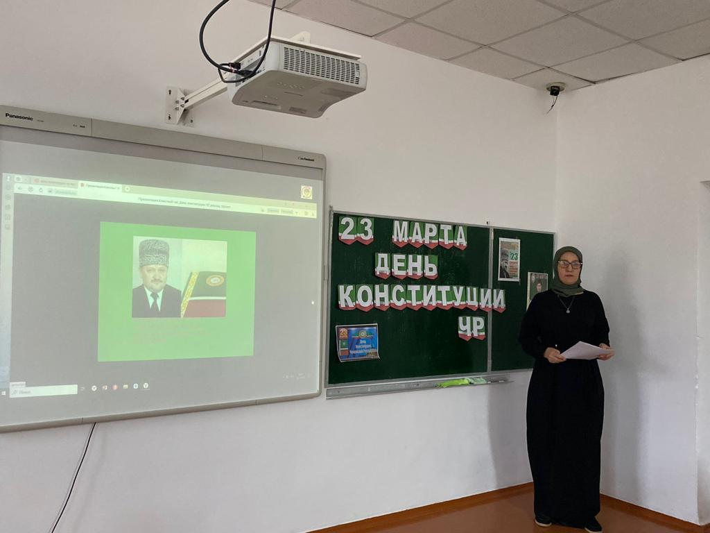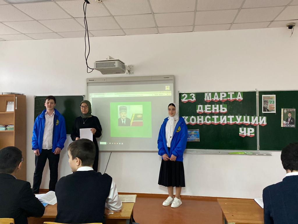 В рамках реализации Единой Концепции духовно–нравственного воспитания и развития подрастающего поколения ЧР - 20 марта 2023 года активисты ЧРОО ЕДЮО «Юные Кадыровцы» под чутким руководством учителя истории Мусхаджиевой Берлант Масихаджиевны, провели урок в 7-А классе приуроченный, ко Дню конституции Чеченской Республики.