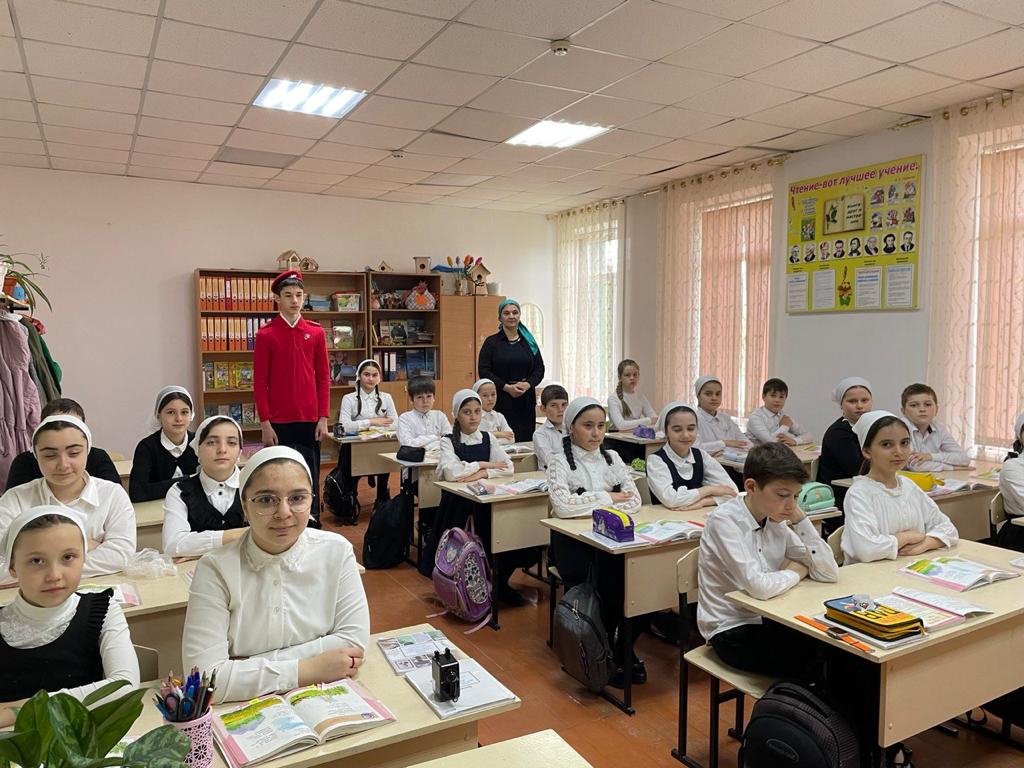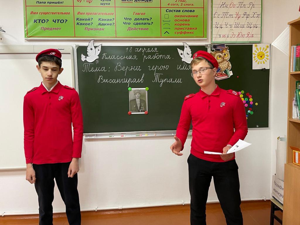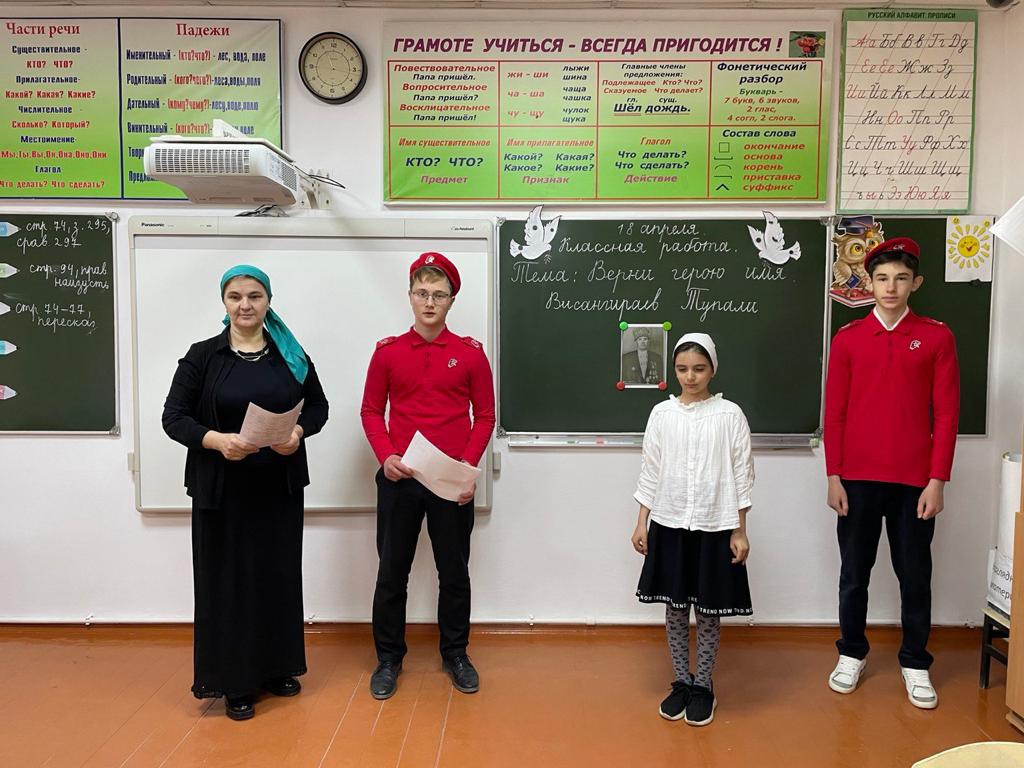 🇷🇺В рамках Всероссийской военно-патриотической акции «Верни герою имя» активисты юнармии Газуев Салман и Даудов Ислам провели в 4 «А» классе Урок мужества «Живая память», посвященный участнику Великой Отечественной войны Висангираеву Тупали, 15.03.2021 года рождения с участием правнучки героя, обучающейся этого класса - Хамидовой Фатимы.