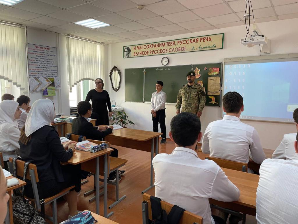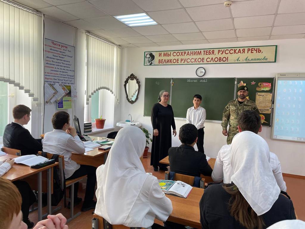 Во время урока участник СВО — герой наших дней - рассказал обучающимся о важном значении спецоперации, о боевых ситуациях, о большой любви к родной стране и соотечественникам, о желании защитить родных и близких людей, о мужестве и героизме сослуживцев. Он уверил, что со всеми трудностями и невзгодами помогает справляться колоссальная поддержка и вера в победу родных людей и всех россиян. Арсен Висанбиевич также отметил необходимость прохождения службы в армии, добросовестного выполнения гражданского и воинского долга перед Отечеством, защиты интересов страны и обеспечения ее национальной безопасности.