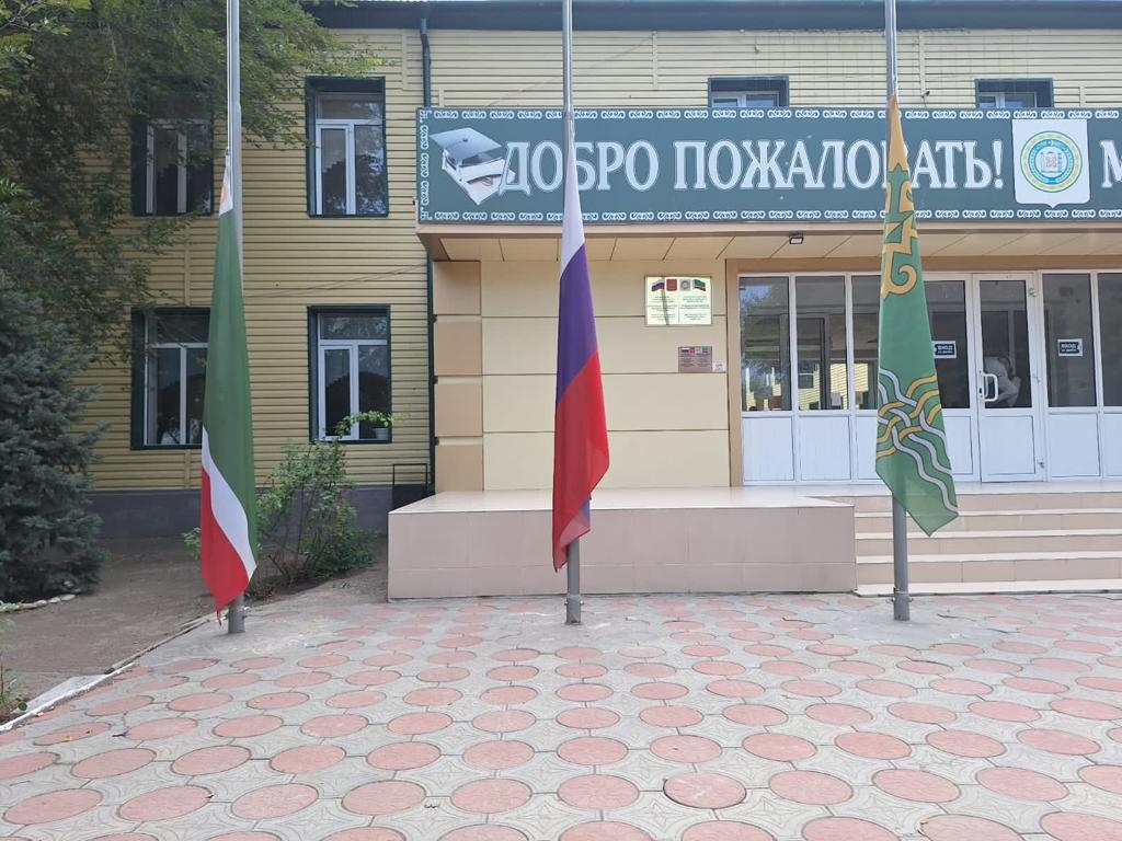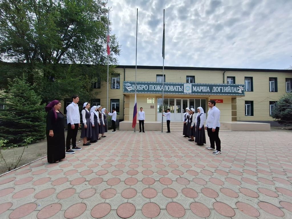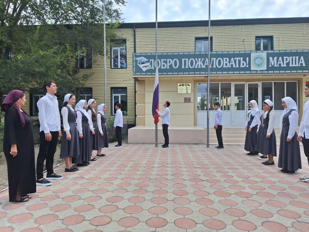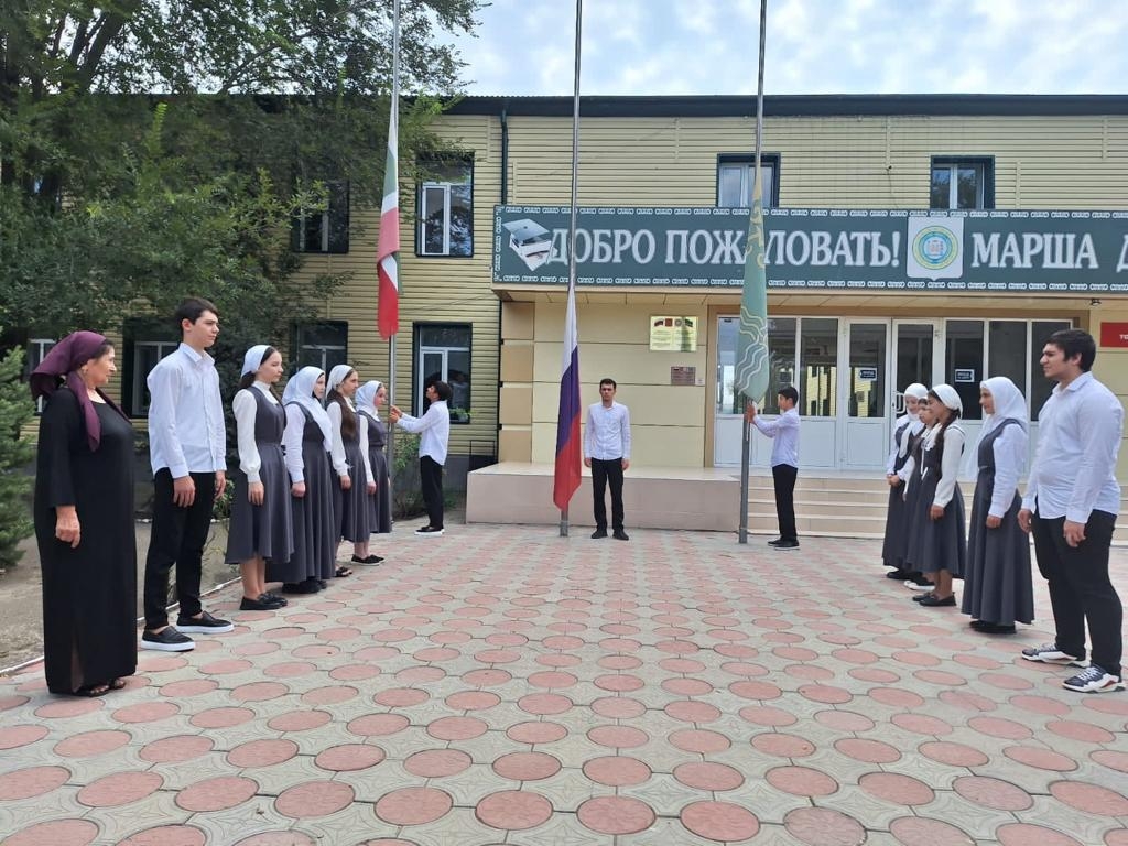 Первая учебная неделя в МБОУ «Шелковская СОШ №3» традиционно завершена спуском флагов Российской Федерации и Чеченской Республики.
