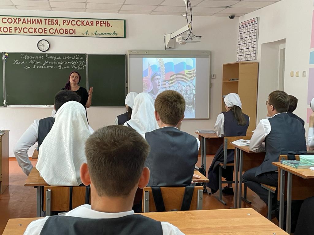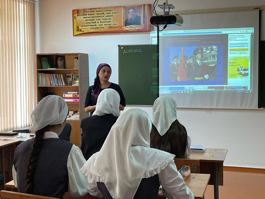 22 сентября 2023 года в рамках IV Всероссийской просветительской акции «Поделись своим знанием» Хамдиева Рената Хасановна, директор Литературного музея М.Ю. Лермонтова для обучающихся 10-11 классов провела урок истории на тему: «Защита Отечества – честь и долг каждого гражданина». Цель урока: - воспитание у учащихся любви к своей Родине, к ее истории, формирование у них желания защищать свою страну;- воспитание чувства гордости за Россию, чувства глубокого уважения и почтения к людям, защищающим нашу Родину в горячих точках;- создание условий для установления связей между поколениями и передачи опыта от старших младшим.