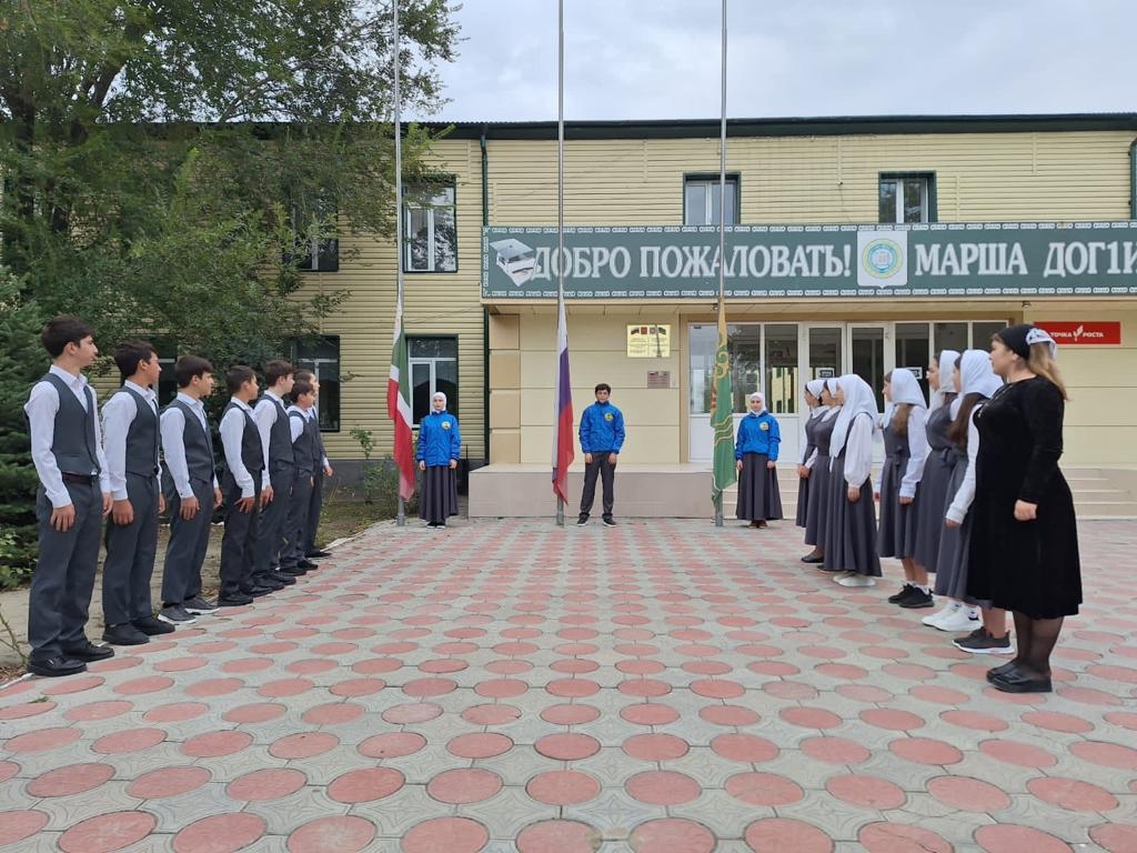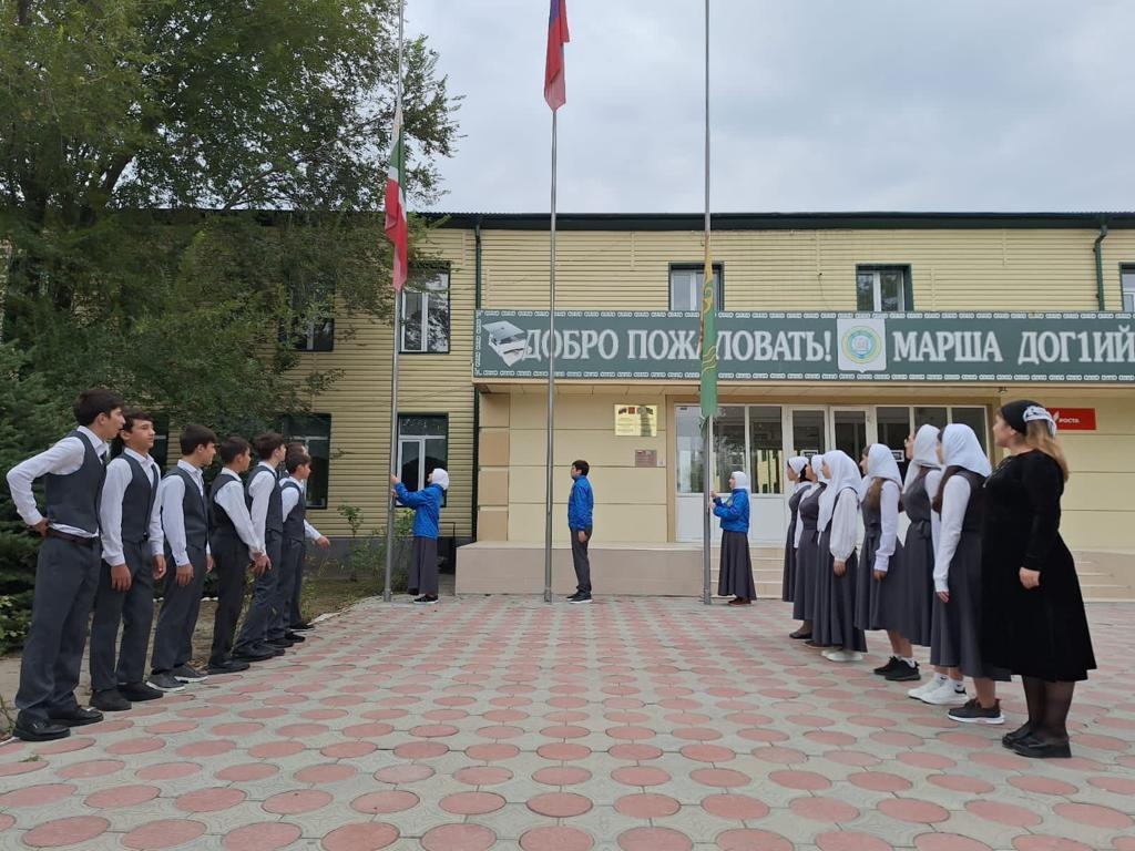 В церемонии поднятия Государственных флагов РФ и ЧР принимали участие обучающиеся 9 «В» класса под руководством зам.директора по воспитательной работе Серсаевой Л.Х.. Право поднять флаги было предоставлено активистам ЧРОО ЕБЮО «Юные Кадыровцы».