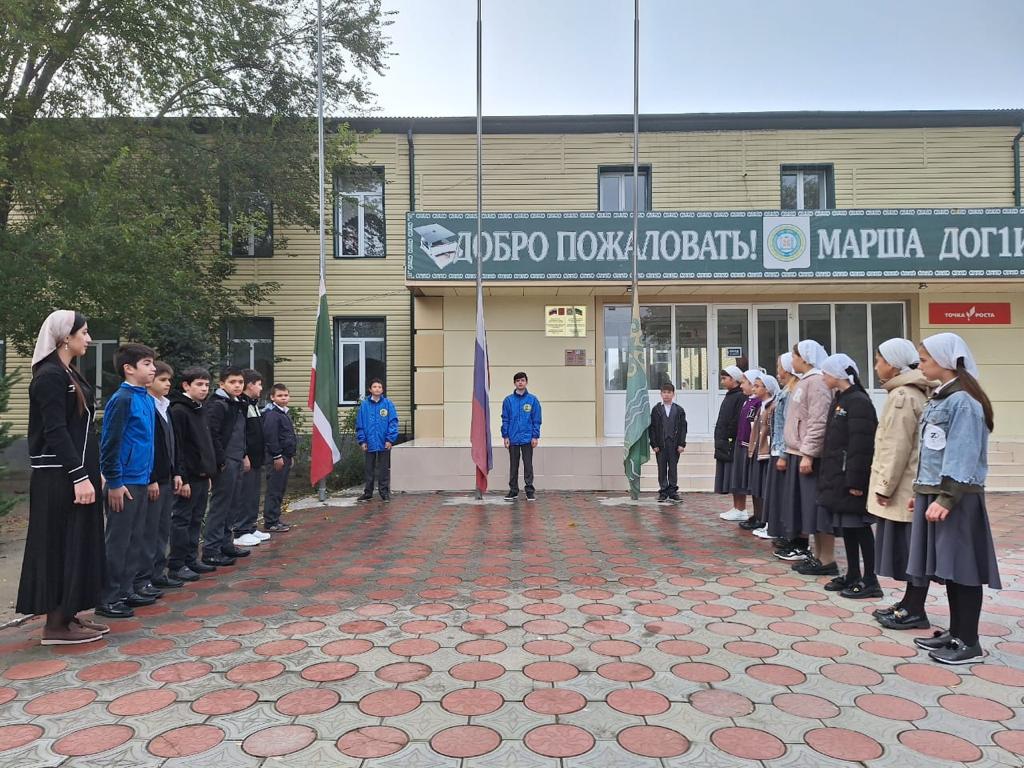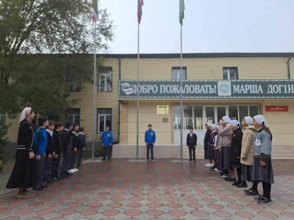 16.10.2023В рамках еженедельной общероссийской традиции 16 октября 2023 года в МБОУ «Шелковская СОШ №3» утро началось с торжественной церемонии подъёма Государственных флагов Российской Федерации и Чеченской Республики. Право поднять флаги предоставили активистам ЧРОО ЕДЮО «Юные Кадыровцы».