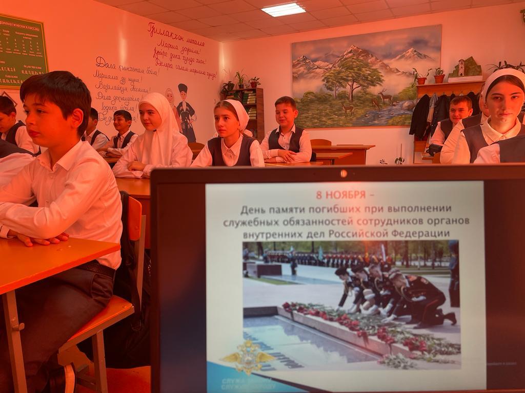 8 ноября 2023 года советник директора по воспитанию и взаимодействию с детскими общественными объединениями Гаибова Аминат Алхазуровна в 7 «Б» классе МБОУ «Шелковская СОШ №3» провела Урок Мужества, посвященный памяти погибших при исполнении служебных обязанностей сотрудников органов внутренних дел, участников СВО. В ходе урока ребята узнали о нелёгком и опасном труде сотрудников полиции, о подвигах Героев Российской Федерации. В завершении урока обучающиеся почтили память погибших минутой молчания.