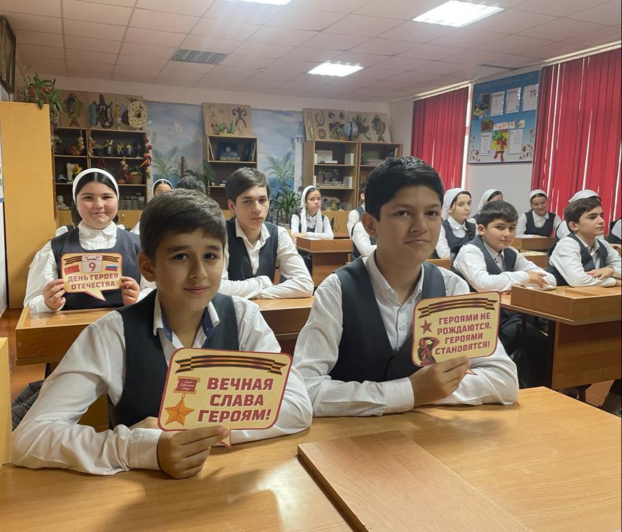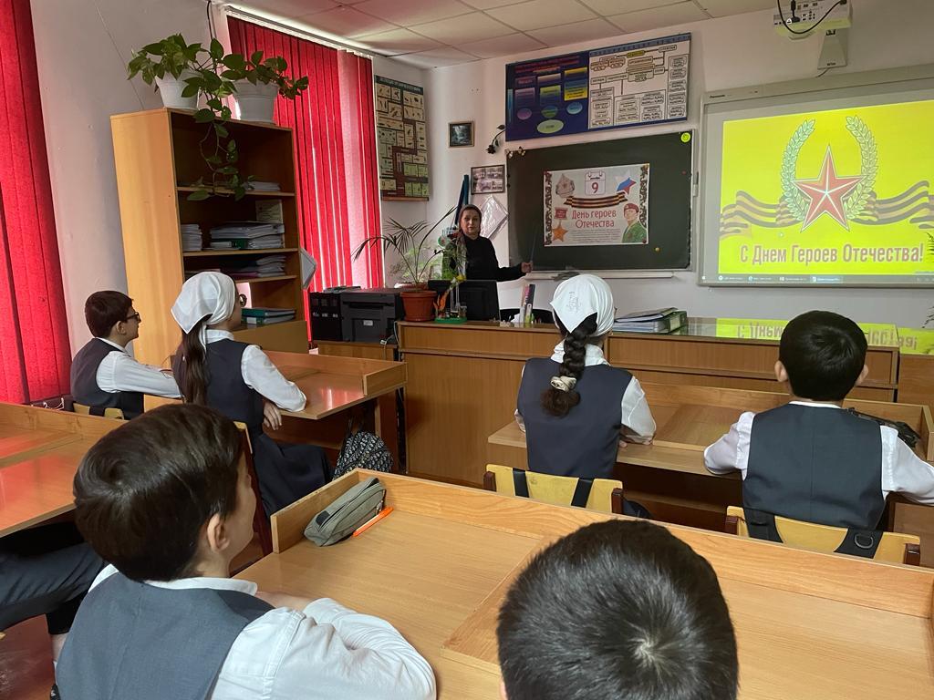 2 декабря 2023 года в МБОУ "Шелковская СОШ № 3" Мавсарова Сияда Алавудиновна в 7 «А» классе провела урок мужества "9 декабря - День Героев Отечества. Герои Российской Федерации - военнослужащие дивизии".