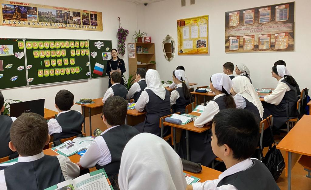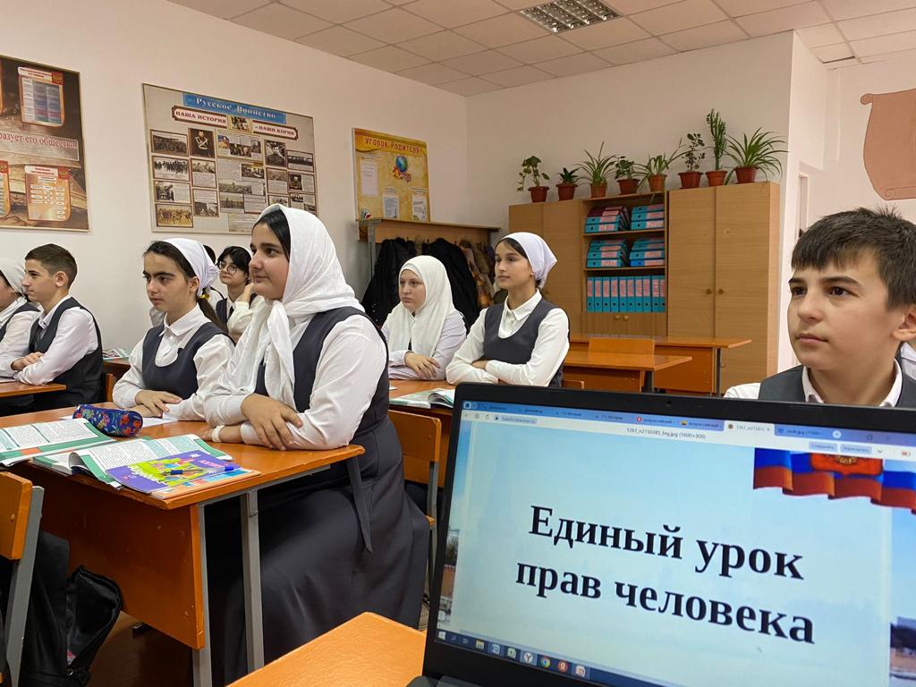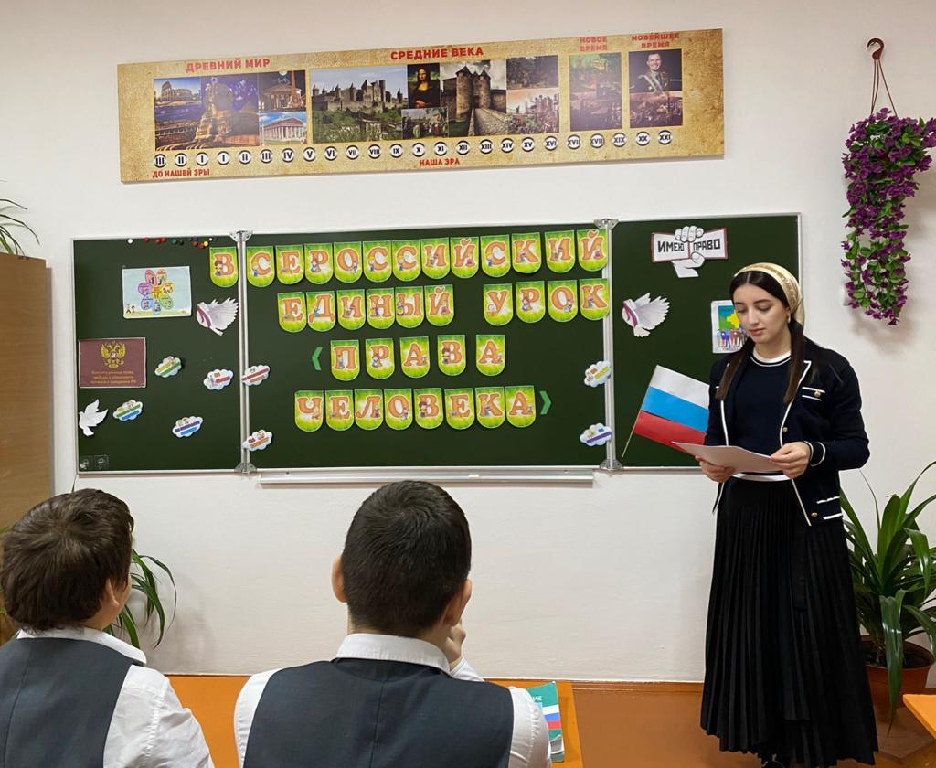 5 декабря 2023 года Тарлаева Хадижат Мовладиевна, учитель истории и обществознания провела в 7 «Г» классе "Единый урок", посвященный 30 -летию действующей Конституции РФ и 75 - летию Всеобщей декларации прав человека.