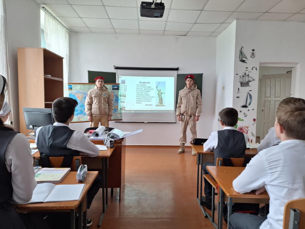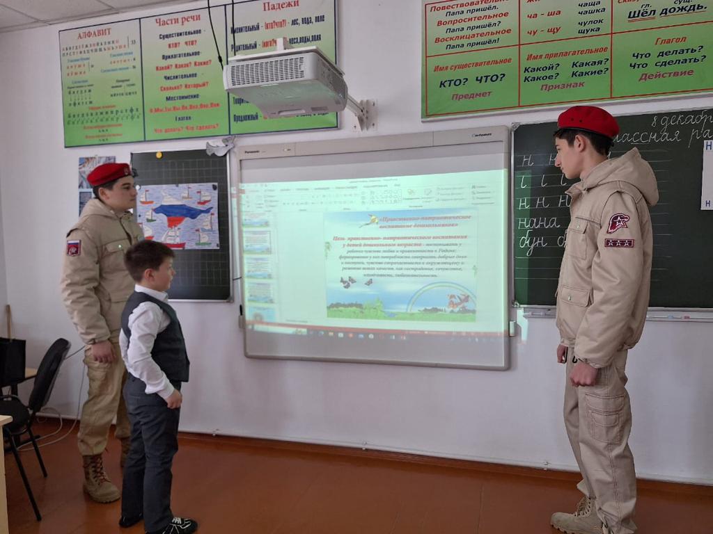 8 декабря 2023 года с целью воспитания патриотических качеств личности в соответствии с моделью «Гражданина - патриота России» Юнармейцы для обучающихся начальной школы провели час патриотического воспитания. Воспитывать патриота надо начинать в начальной школе. Младший школьный возраст – это период впитывания накопления знаний. В этом возрасте идёт развитие высших чувств: нравственных, интеллектуальных, эстетических. Этот возраст представляет собой такой период становления личности, когда формируется чувство любви к Родине, закладываются предпосылки гражданских качеств, уважение к людям и понимание окружающих независимо от их социального происхождения, национальной принадлежности, языка и вероисповедания.