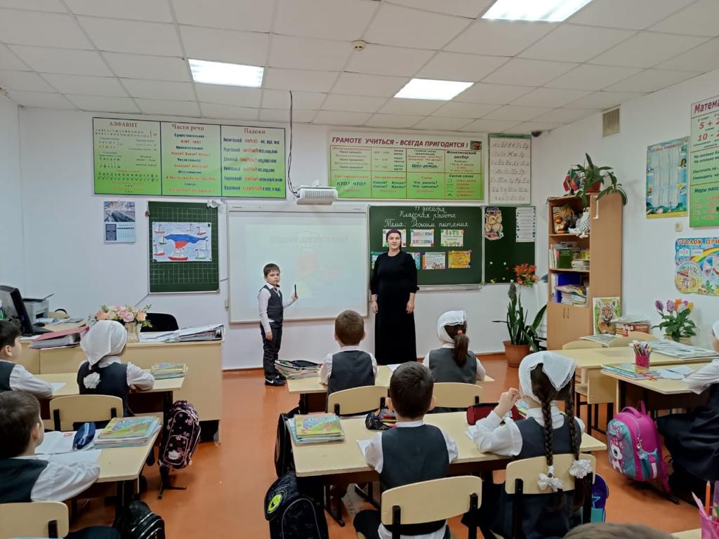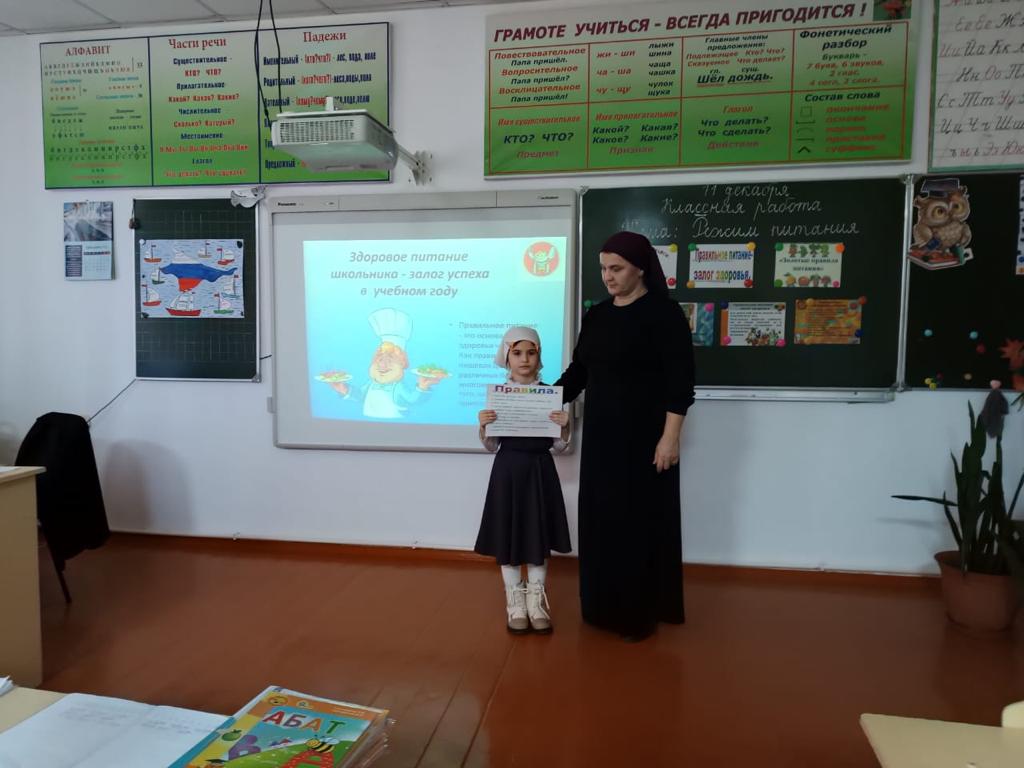 В рамках «Недели здорового питания» 11 декабря 2023 года Витаева Таиса Ламсултановна провела беседу в 1 «А» классе на тему: "Режим питания". Первоклашки усвоили важные правила: чтобы пищеварительная система работала без сбоев нужен правильный РЕЖИМ питания;есть нужно столько, чтобы не испытывать чувство голода;переедание ведет к ожирению;"Еда всухомятку"– ВРЕДНА!!