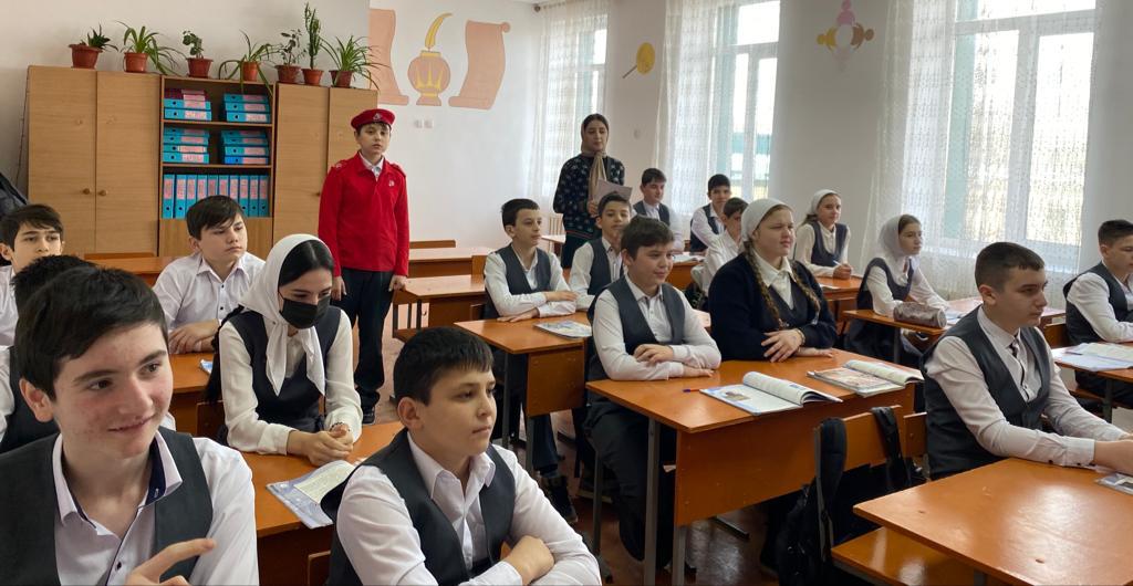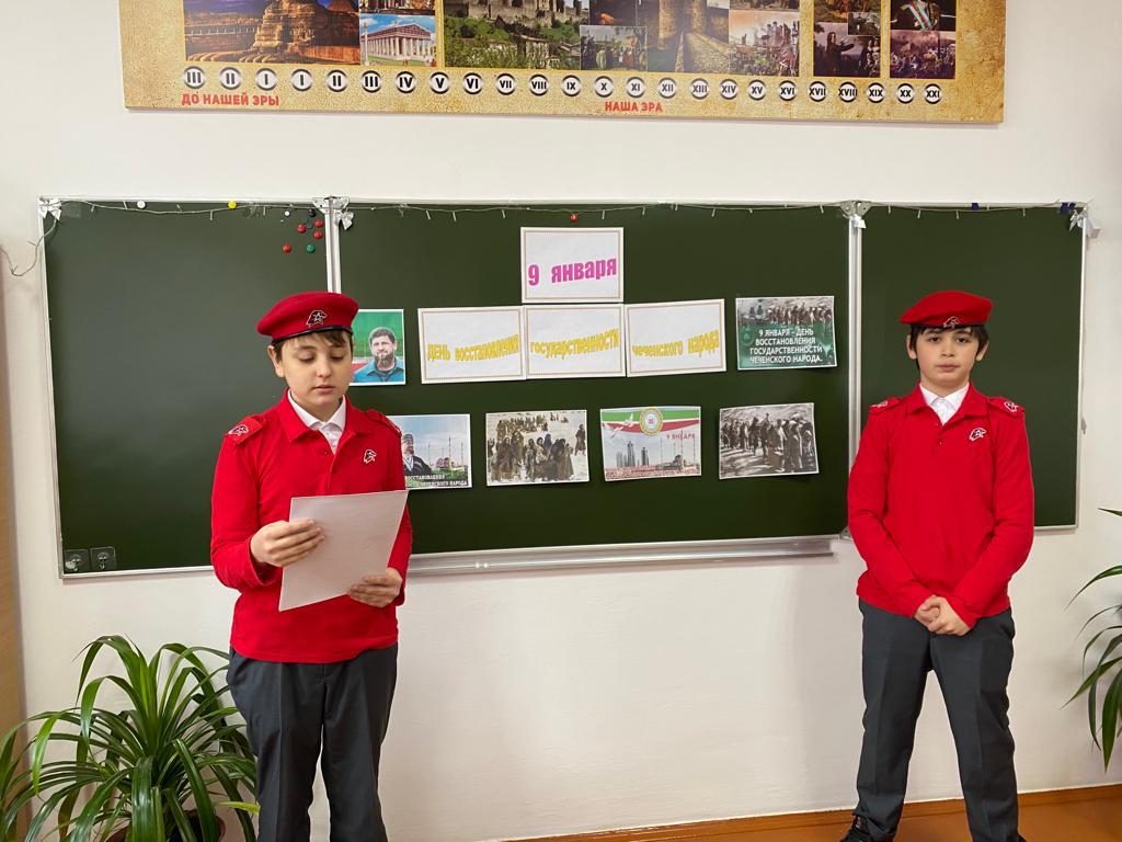 12 января 2024 года Тарлаева Х.М., учитель истории вместе с юнармейцами Дауткериевым Ибрагимов и Кадиевым Магомедом провели урок патриотизма на тему: " 9 января - День восстановления государственности чеченского народа ". Цель урока - ознакомить обучающихся с историей чеченского народа, привить любовь к Родине.