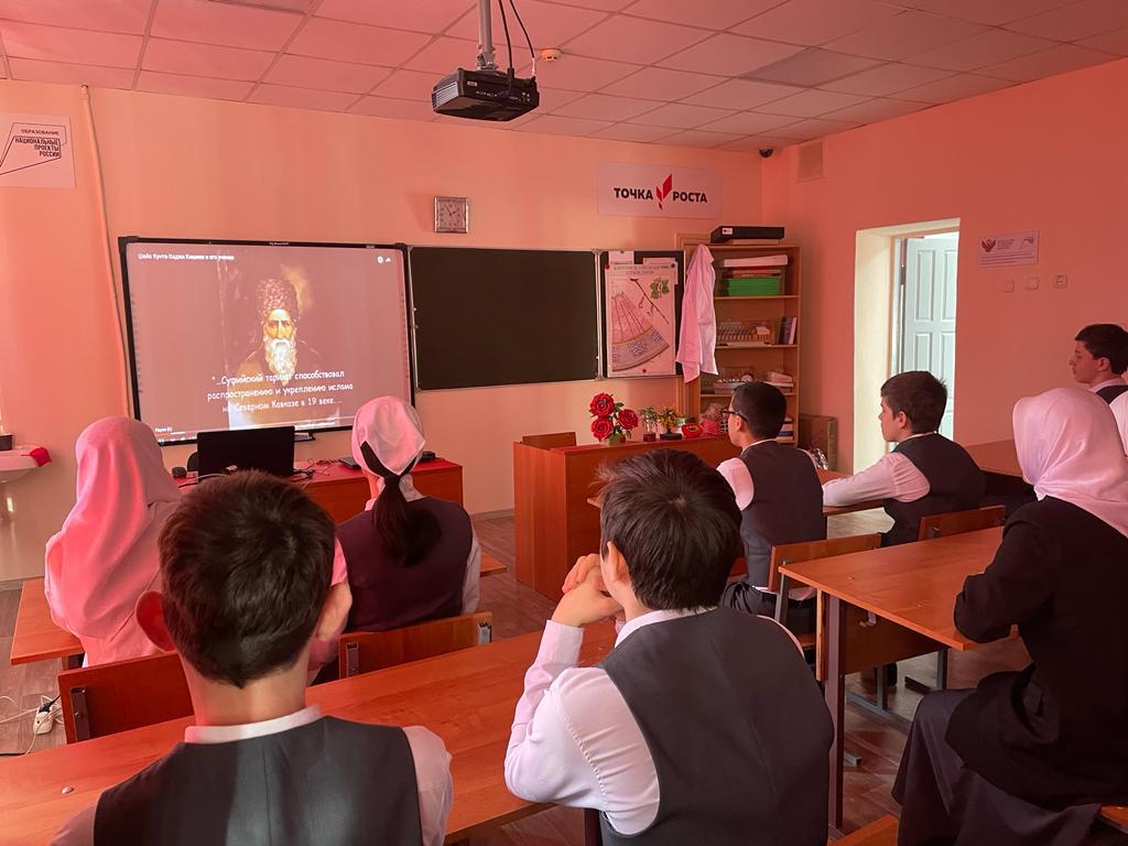 В ходе просмотра видеоматериала ребята узнали о том, что Кунта-Хаджи Кишиев — один из самых почитаемых в республике святых. В своих нравоучениях он призывал к миру, отрицал любую войну, говорил, что нельзя отвечать злом на зло, просил прощать своих врагов.