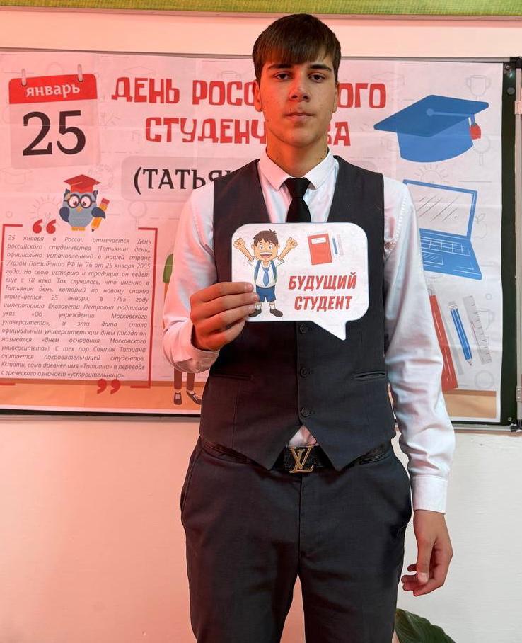 25 января 2024 года Грибова Аминат Алхазуровна, советник директора по воспитанию провела "Классную встречу" с обучающимися 9В класса «И вновь январь, и снова день Татьяны…! (день Российского студенчества)