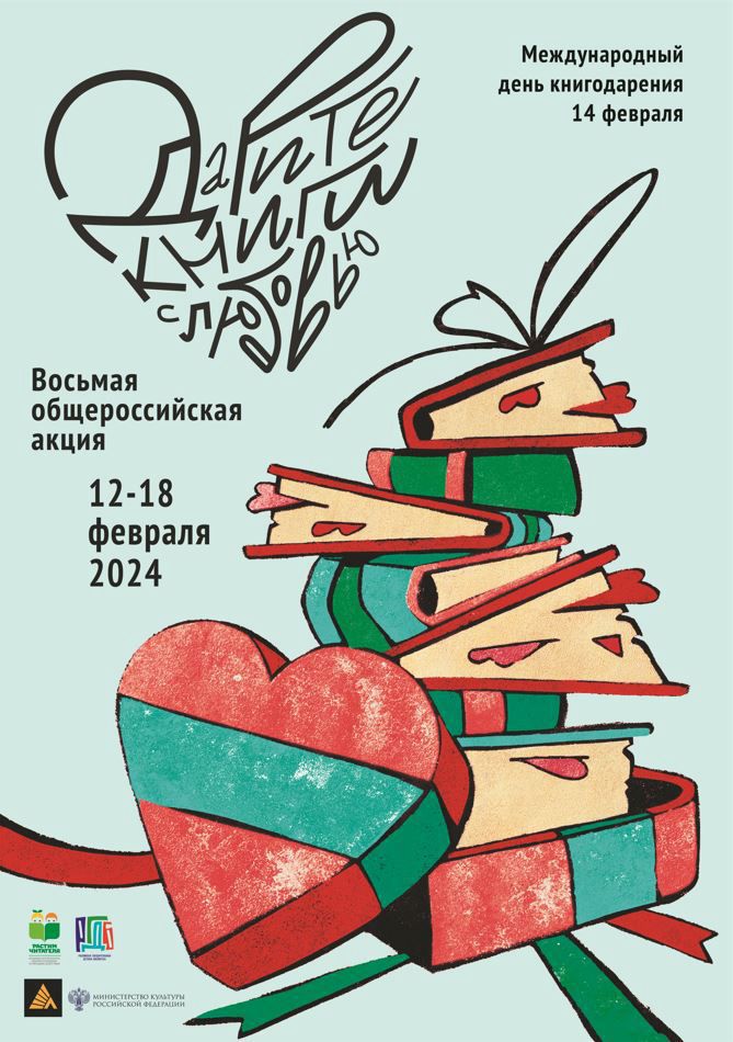 Объявлена Восьмая общероссийская акция «Дарите книги с любовью – 2024». Инициаторы акции – Российская государственная детская библиотека и Ассоциация «Растим читателя», проводят её при поддержке Минкультуры России, Российского книжного союза и Ассоциации книгораспространителей России.