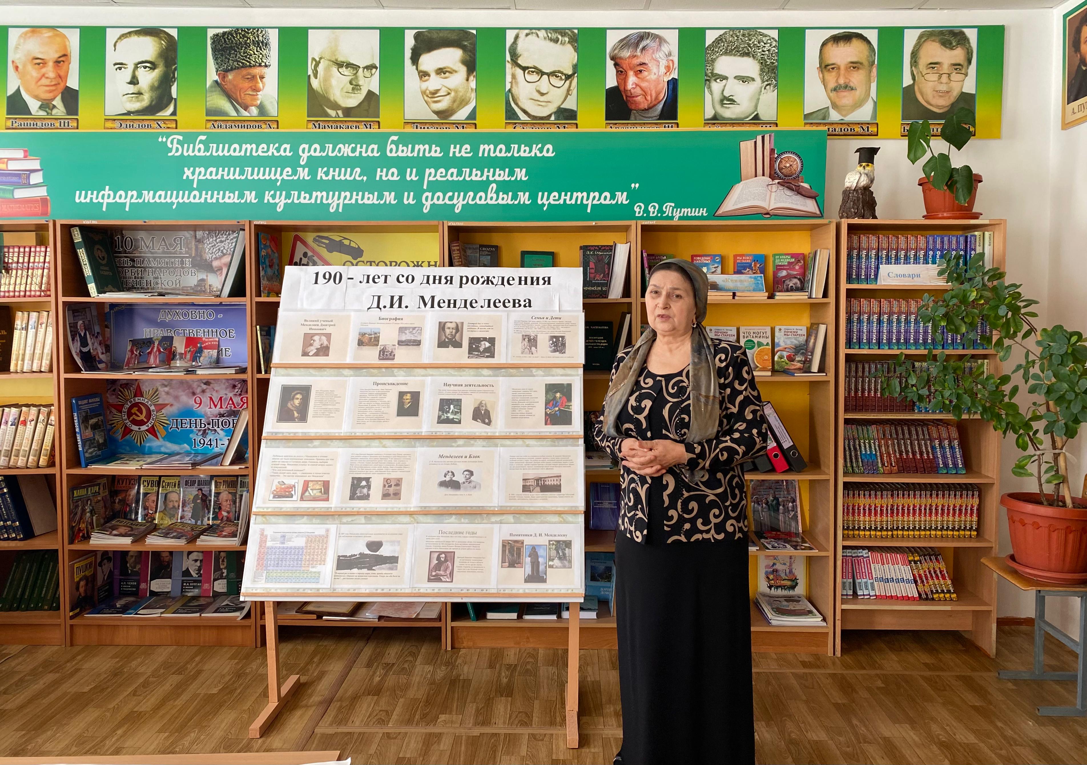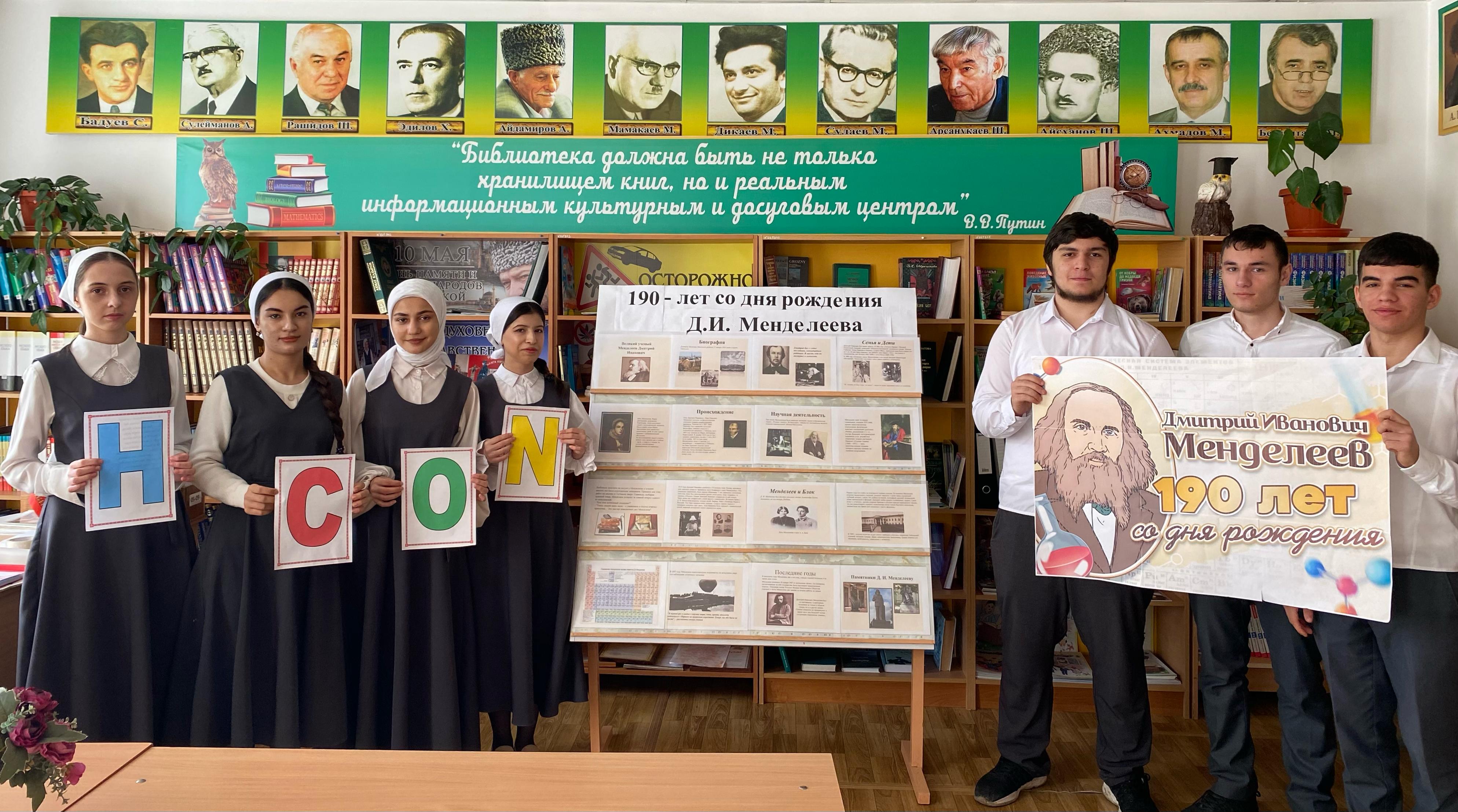 8 февраля исполняется 190 лет со дня рождения великого ученого Д.И. Менделеева «Гордость российской науки». Под таким названием Мавсарова С.А., учитель химии провела час познания, который включил в себя несколько великих страниц о жизни и научных исследованиях великого ученого, о первых серьезных успехах в науке.Также заведующей школьной библиотеки Джабаевой М.А. была оформлено книжная выставка, на которой представлена литература, освещающая жизнь и научные достижения блестящего человека.