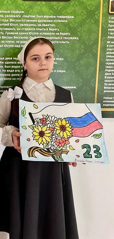 В преддверии Дня защитника Отечества обучающаяся 3А класса Радуева Раяна приняла участие во Всероссийской акции детских рисунков «Нарисуй защитника Отечества».