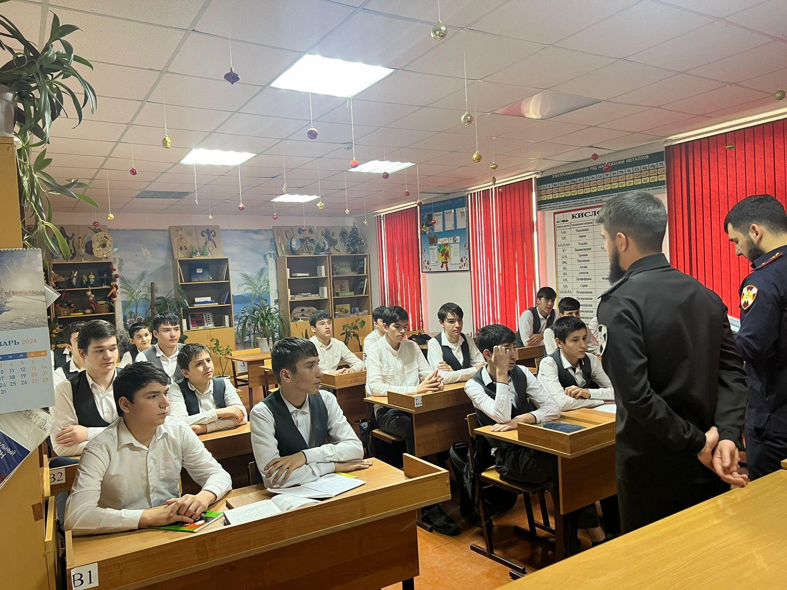 7 марта 2024 года психолог ОВО по Шелковскому району ФФГКУ «УВО ВНГ России по ЧР», лейтенант полиции Ахмадов И.В совместно с Долгуев Ю.Р., выпускником нашей школы провел профориентационную беседу среди обучающихся 9 - 11 классов.