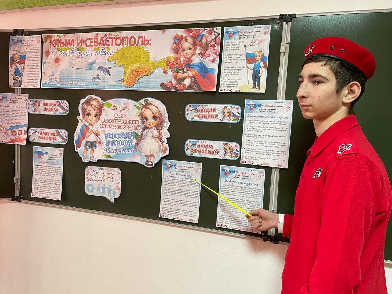 🗣️ Во время урока активисты Юнармии рассказали обучающимся о том, что история полуострова Крым и города Севастополя неразрывно связана с Россией, и сегодня мы празднуем 10-летие с момента, как население Крыма сделало свой выбор, восстановив историческую справедливость.