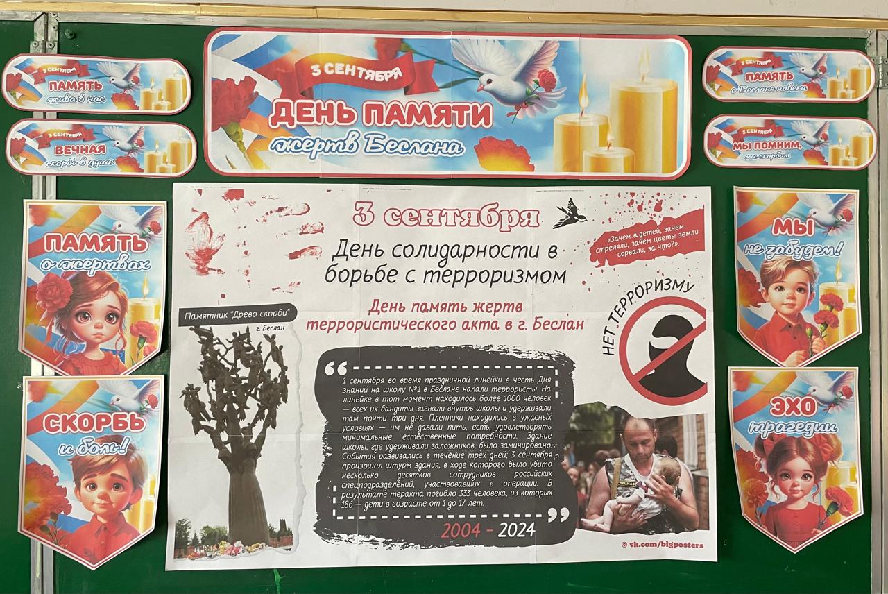 День солидарности в борьбе с терроризмом. Для всей России этот день стал днем общенациональной скорби, а дата 3 сентября объявлена Указом президента России Днем солидарности в борьбе с терроризмом.