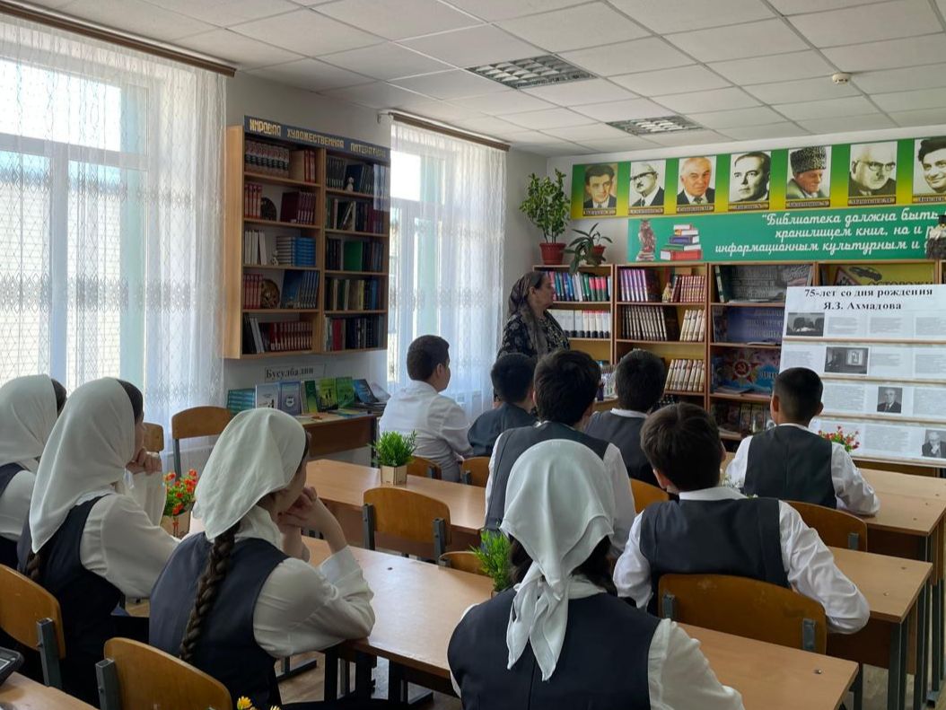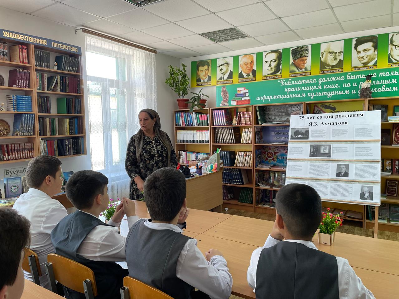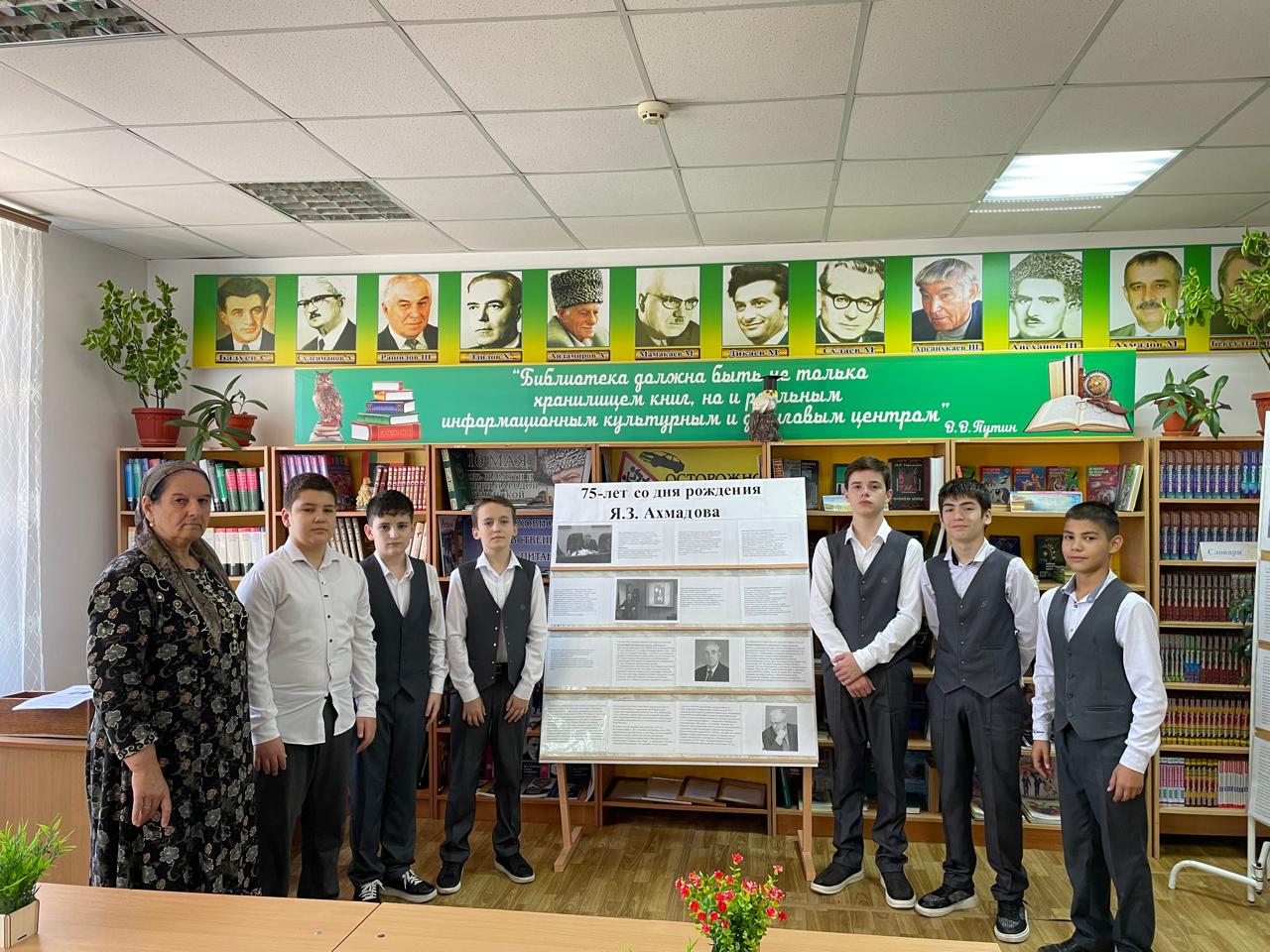 Заведующая школьной библиотекой Джабаева М.А. оформила и провела для обучающихся 9-11 классов обзор книжной выставки «Жизнь и творчество Мусы Ахмадова», посвященной 75-летию со дня рождения чеченского писателя, поэта, драматурга, члена Союза писателей Чечни, главного редактора литературно-художественного журнала «Вайнах» — Ахмадова Мусы Магомедовича.