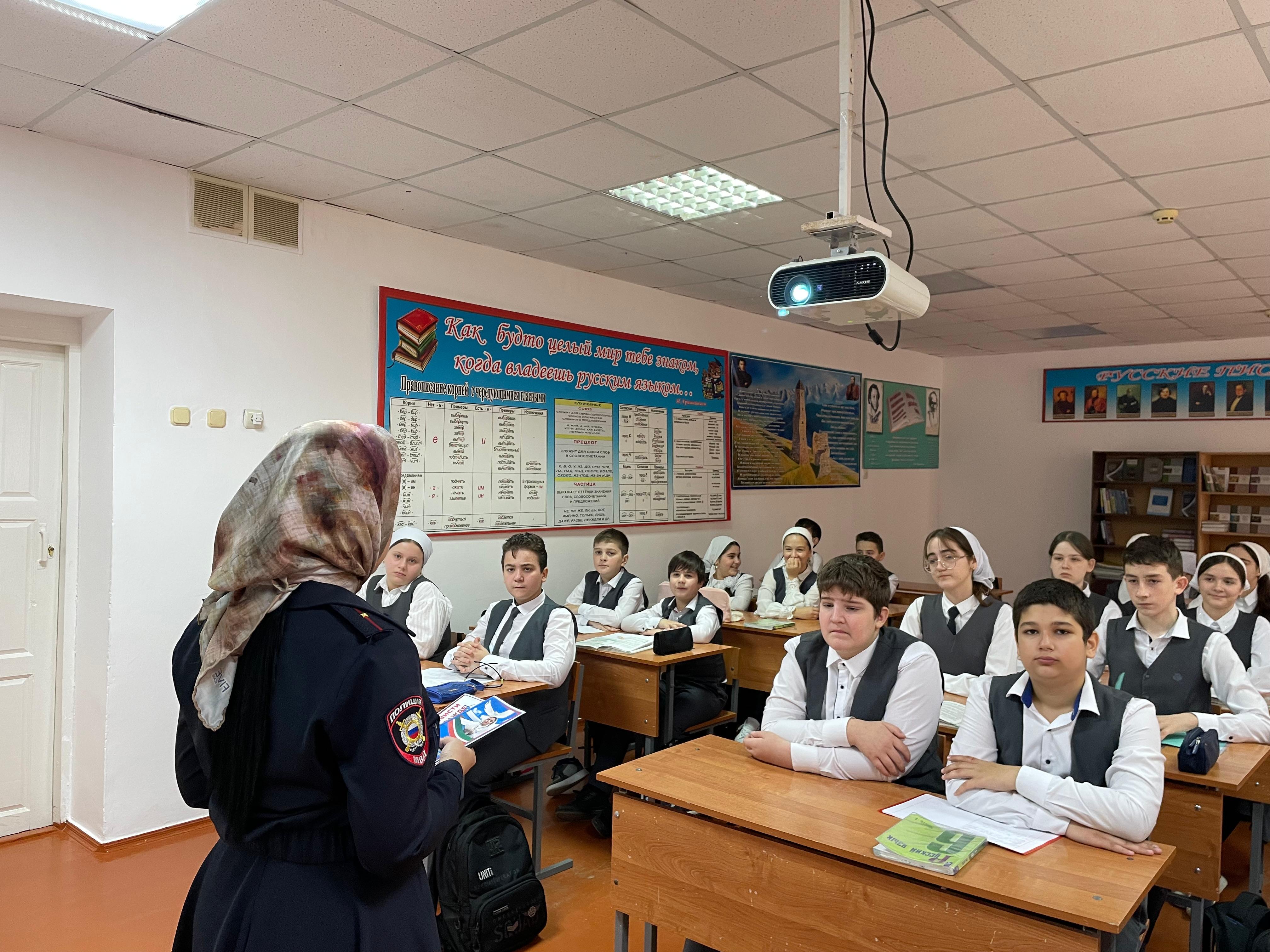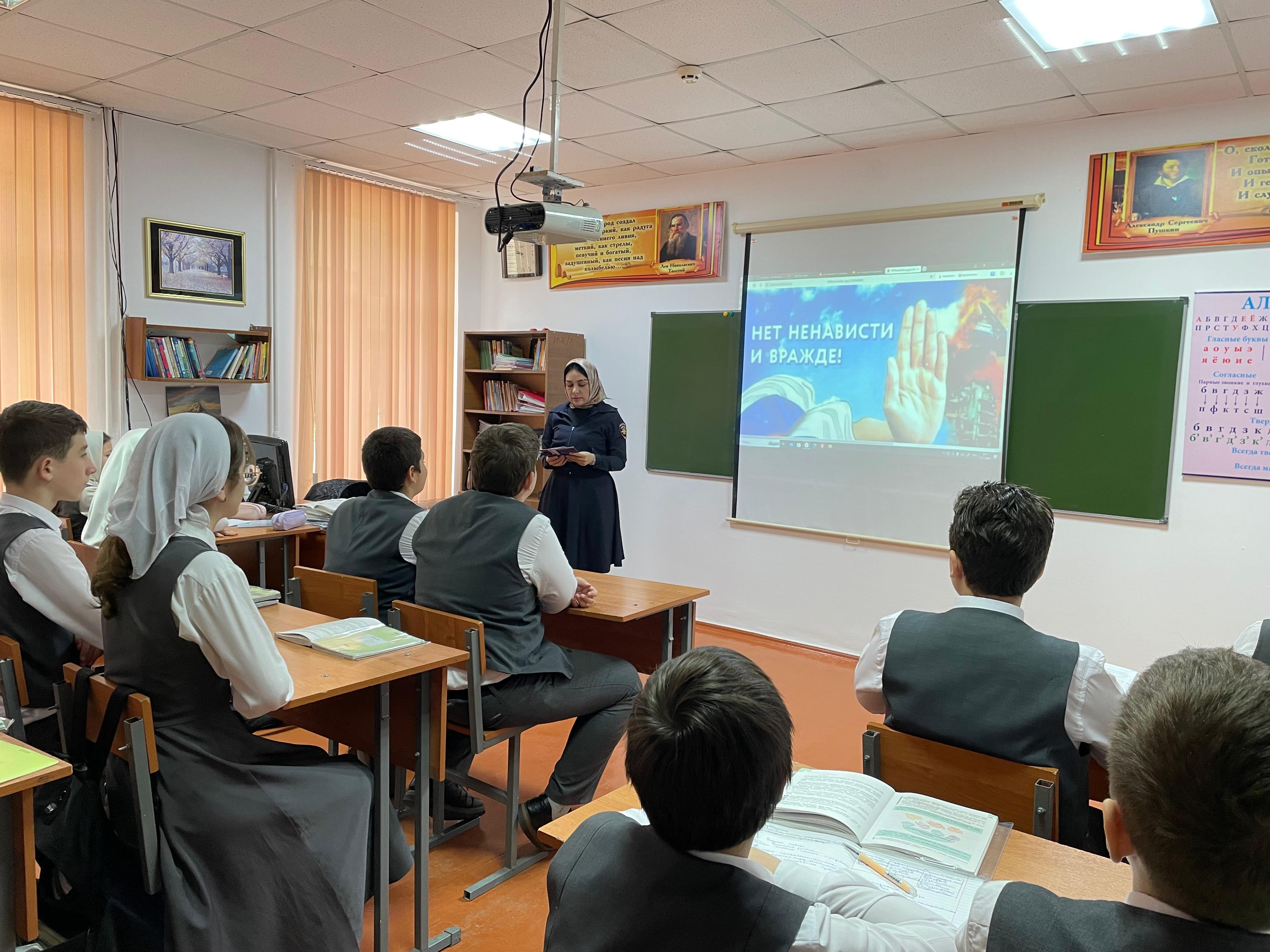 11 ноября 2024 года в рамках акции «Нет ненависти и вражде» инспектор ПДН ОМВД России по Шелковскому району младший лейтенант полиции Улубаева Индира Зуратовна провела беседу о непринятии идеологии экстремизма с обучающимся 9-х классов.