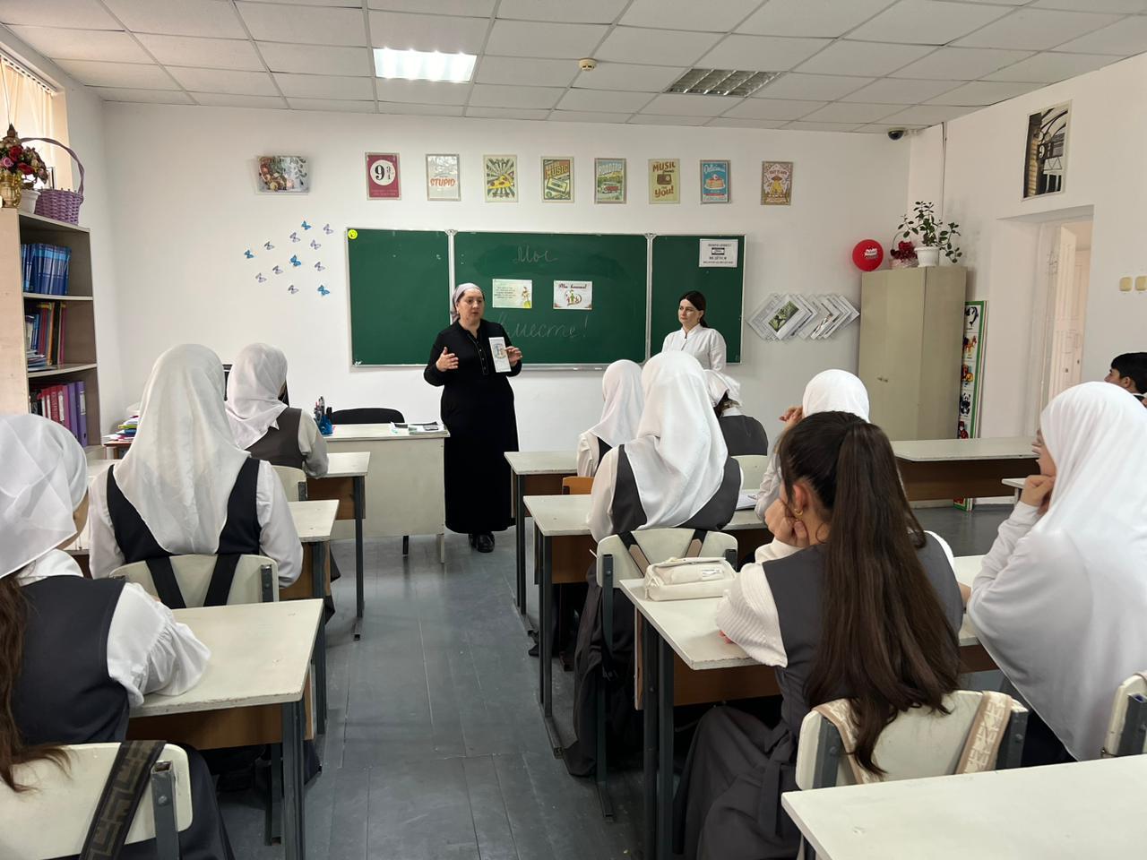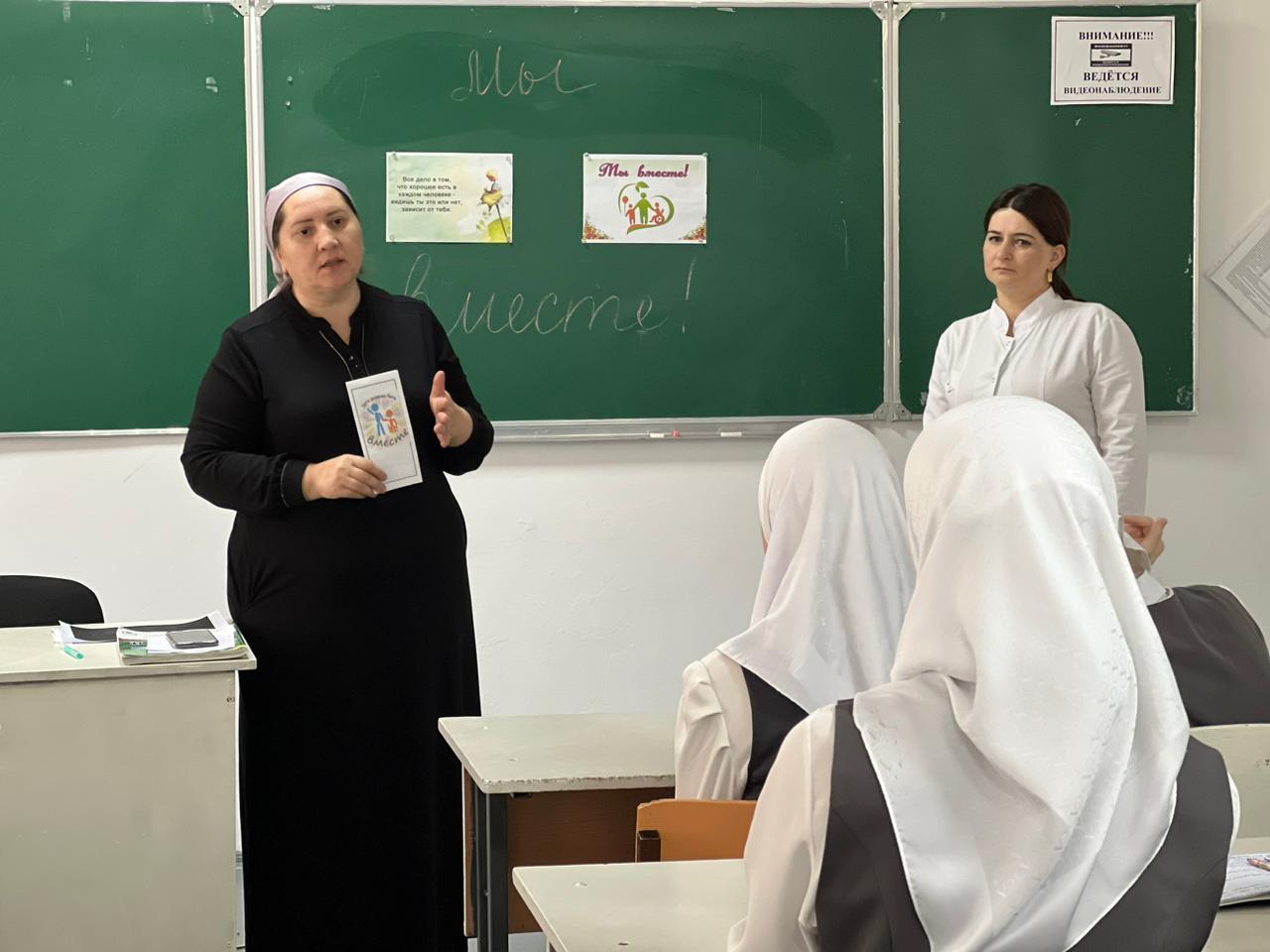 С целью воспитания толерантного отношения к людям с ограниченными возможностями здоровья - Аушева Т.Т, педагог-психолог вместе с медсестрой Идрисовой Д.Ш. среди обучающихся 7-8 классов провела мероприятие, посвящённое Международному Дню инвалидов: «Мы разные, но мы вместе!»