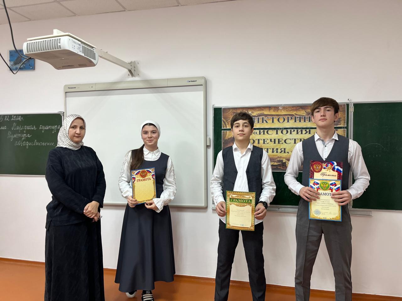 5 декабря 2024 года Мусхаджиева Б.М., учитель истории и обществознания среди обучающихся 9А класса провела интеллектуальную викторину «История Отечества: события, люди».