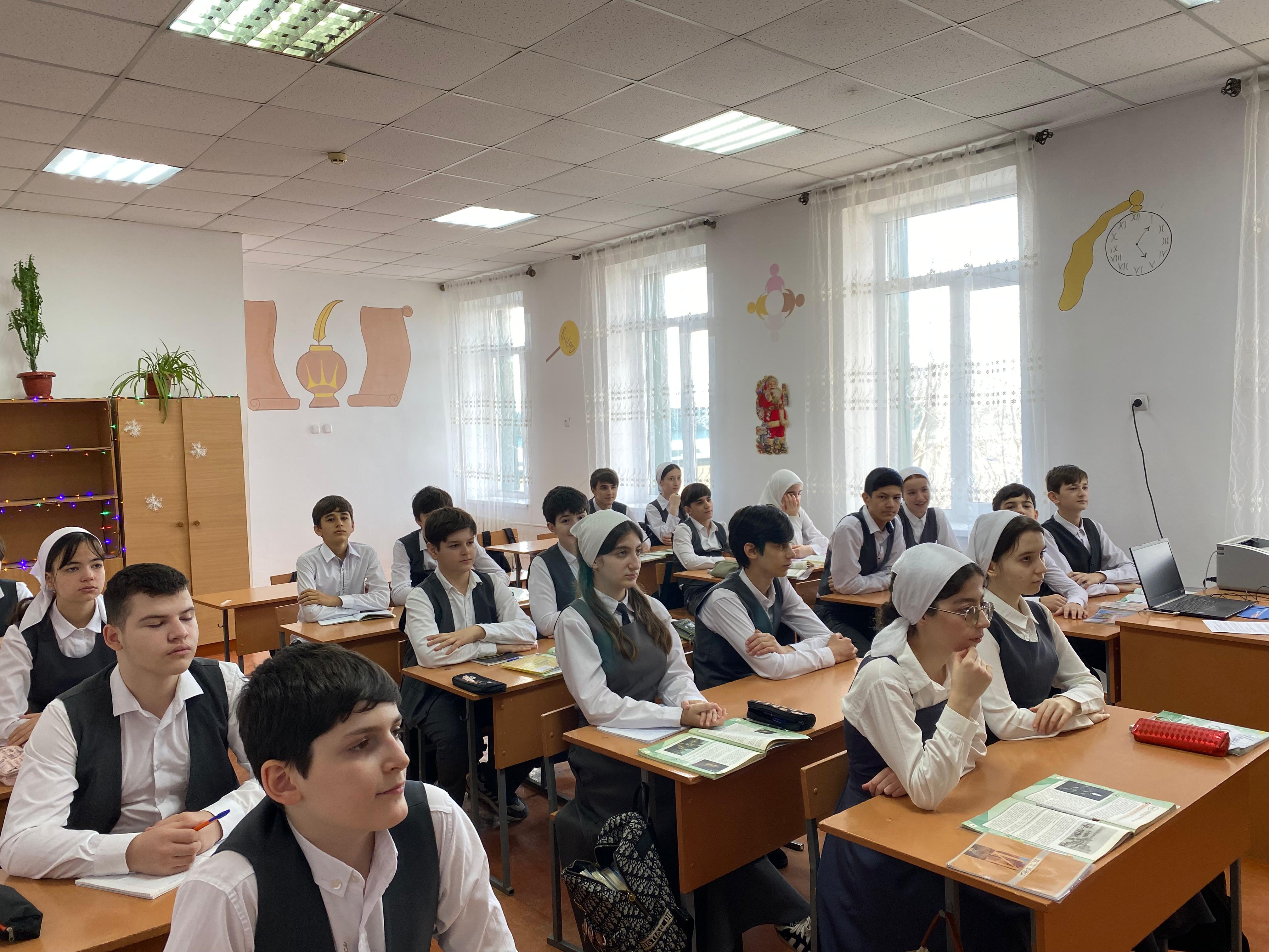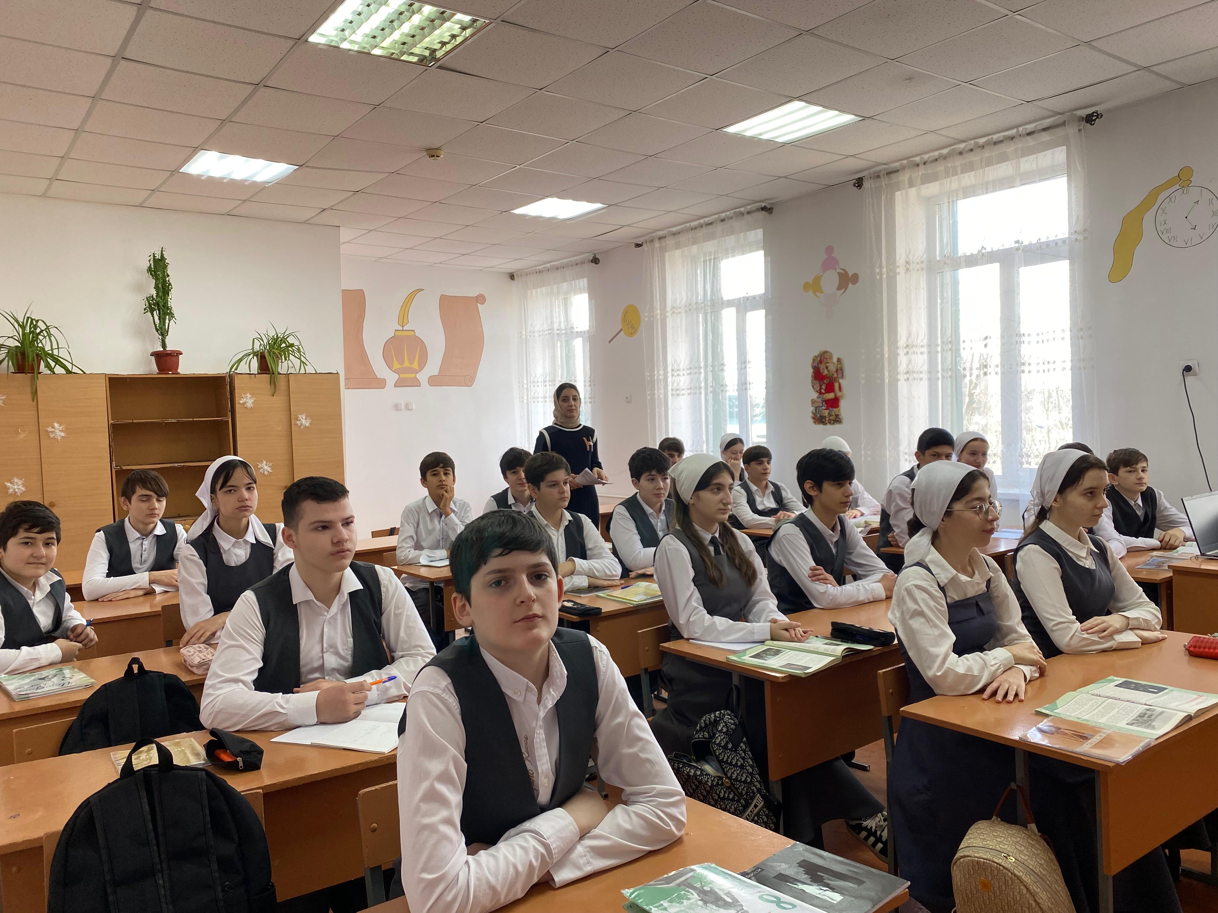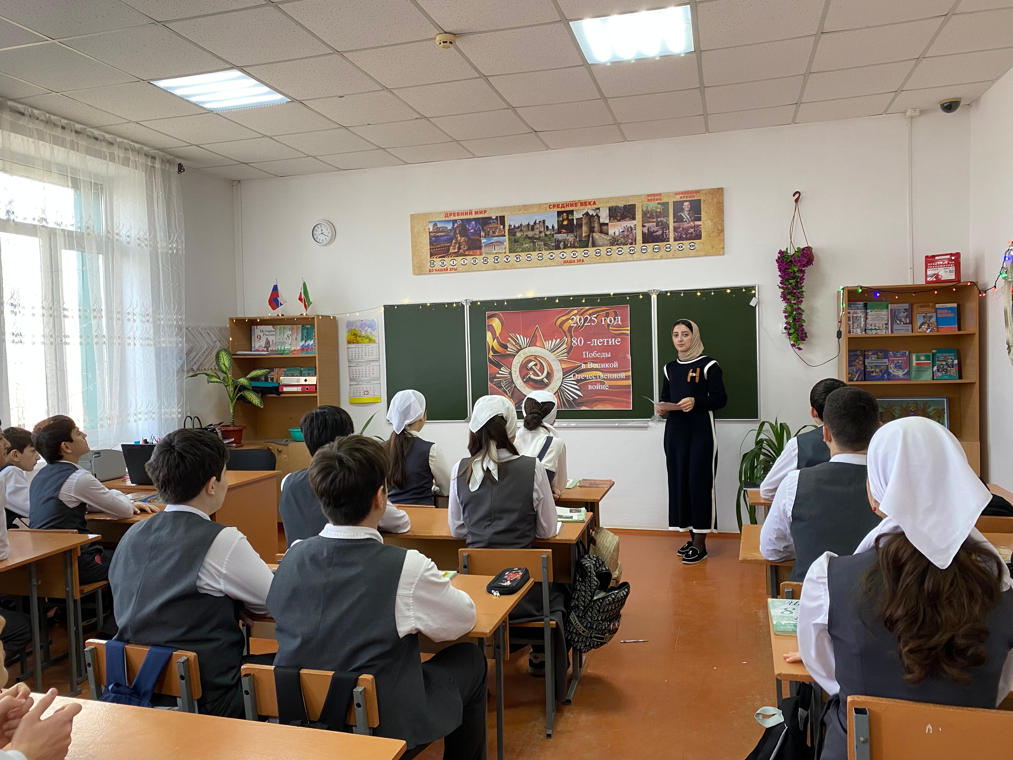 С целью патриотического воспитания подрастающего поколения в 8А классе Тарлаева Х.М., учитель истории и обществознания провела Урок мужества, посвященный 80-летию Победы над фашисткой Германией.