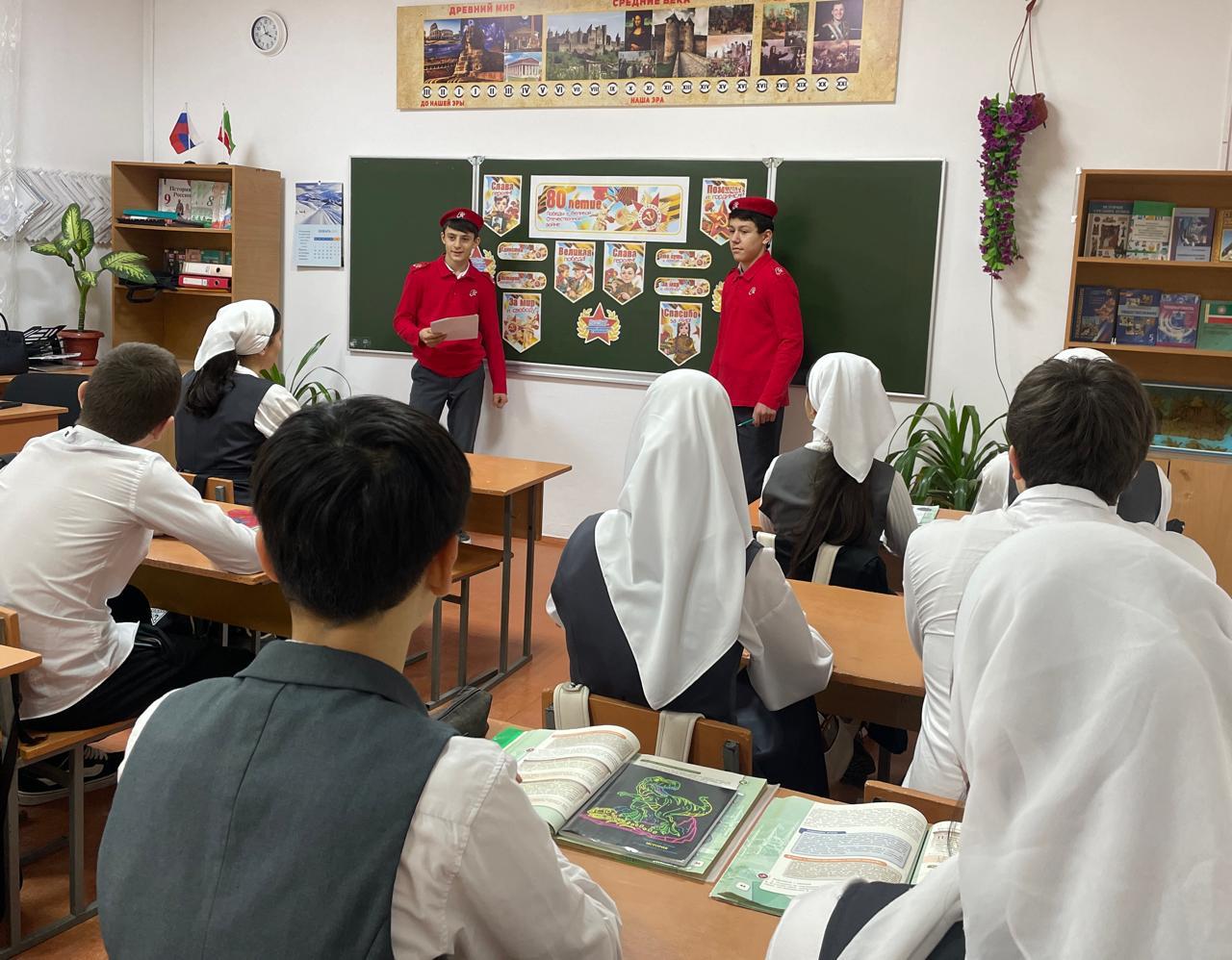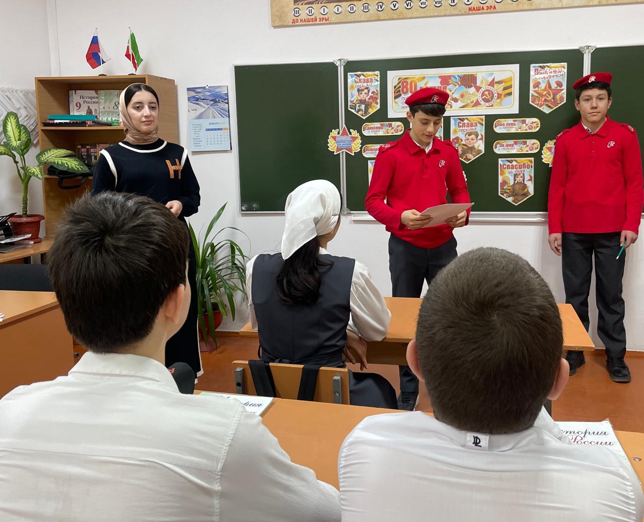 14 января 2025 года юнармейцы вместе с Тарлаевой Х.М., учителем истории провели урок исторической памяти в 7Б классе . Урок был посвящен важной теме – сохранению памяти о героизме наших предков, их подвигах во время Великой Отечественной войны. В ходе мероприятия ребята узнали об истории Великой Победы, обсудили значение этого события для нашей страны и всего мира.