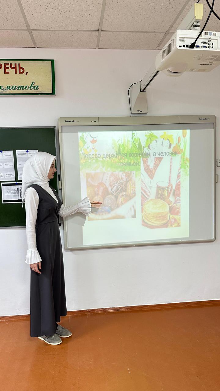 Эльмира Алавудиновна рассказала ребятам об истории семьи, о взаимоотношениях нескольких поколений, о том, что семья является первым и главным учителем для ребенка. Одной из важных составляющих «семьи» могут быть семейные традиции.