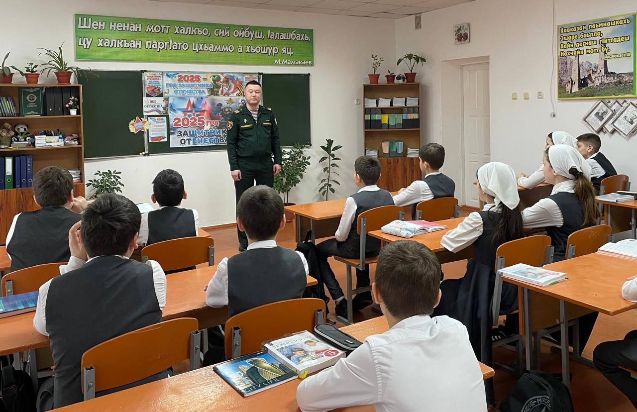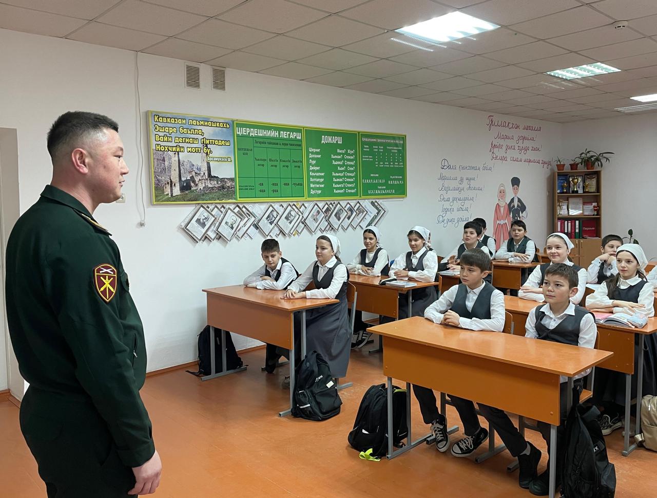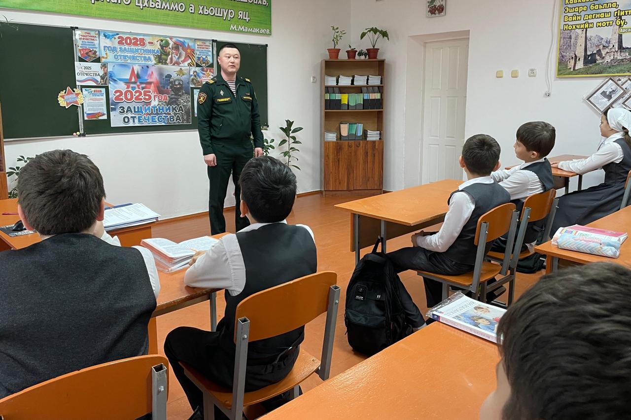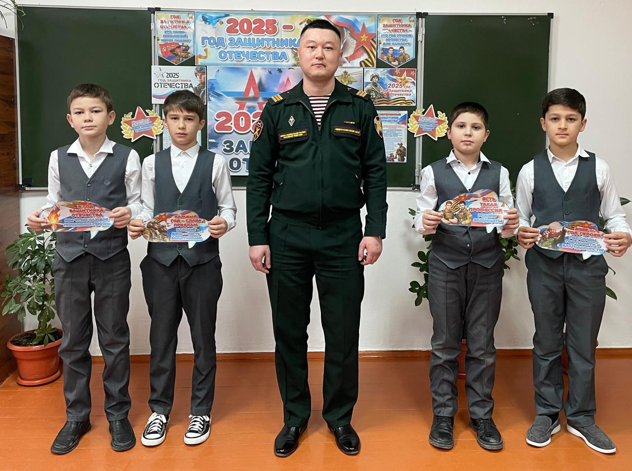 В преддверии Дня защитника Отечества, 4 февраля 2025 года сержант в/ч - 6904 Исмухамбетов Э.Х. для обучающихся 5А класса МБОУ «Шелковская СОШ №3» провел урок мужества «Есть такая профессия - Родину защищать!».