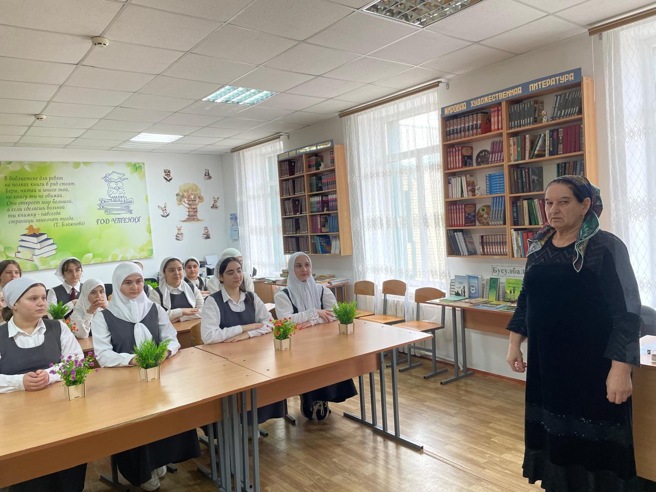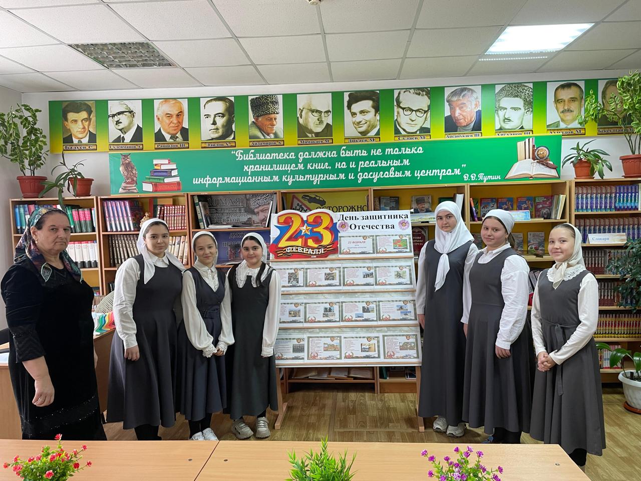 Джабаева М.А., зав.библиотекой для своих читателей провела обзор-беседу у книжной выставки. В ходе беседы рассказала об истории возникновения праздника Дня защитника Отечества, о тех, кто сторожит покой граждан нашей страны, защищает честь и достоинство Отечества.