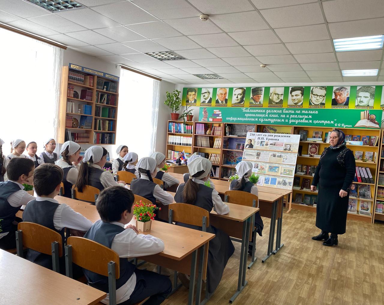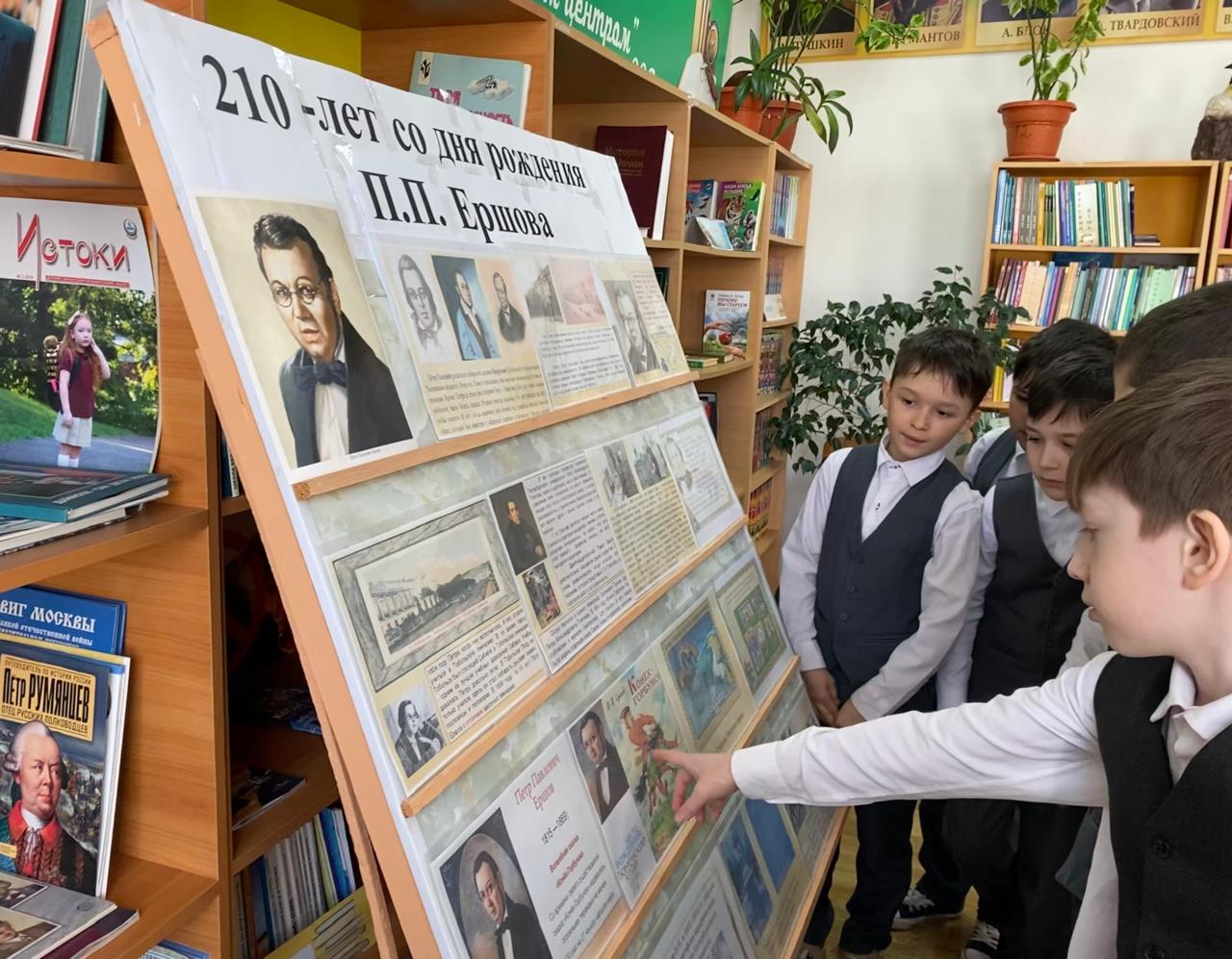 В честь юбилея писателя в школьной библиотеке Джабаева М.А., зав.библиотекой оформила книжную выставку «Добрый сказочник Ершов».