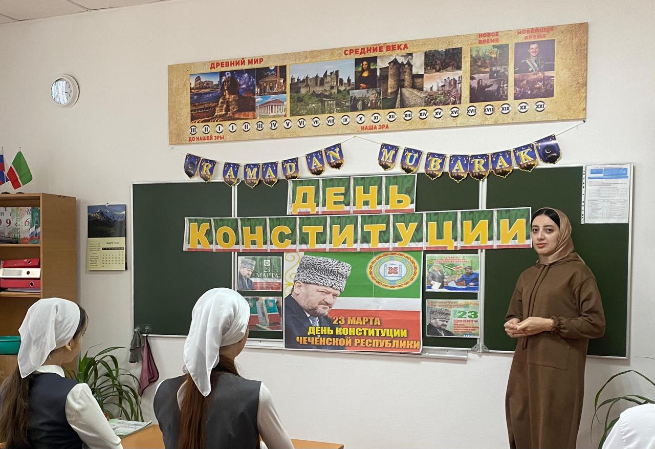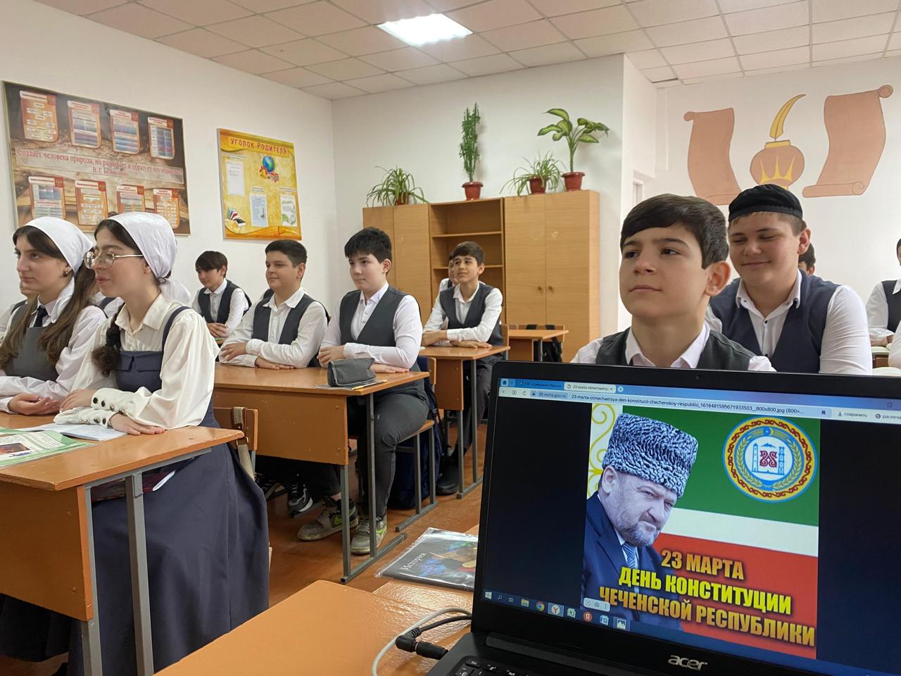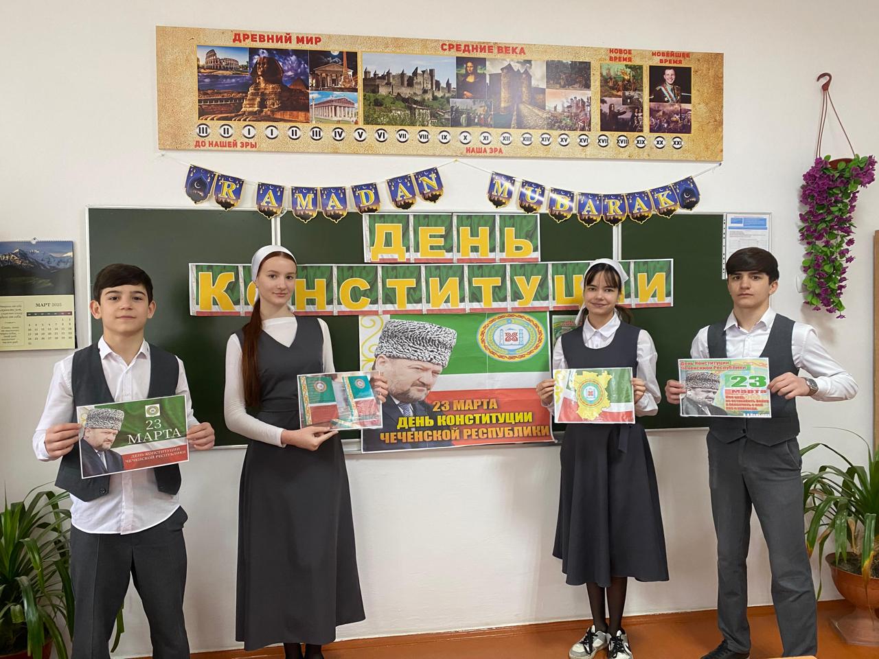 Классные руководители в своих классах провели классные часы на темы: «Мы непобедимы если мы едины», «Государственные символы ЧР – герб, флаг, гимн», показали обучающихся видеоматериалы о принятии Конституции ЧР и событиях, предшествовавших этой дате. Рассказали о Конституции Чеченской Республики, которая была принята благодаря первому Президенту ЧР, Герою России Ахмат-Хаджи Кадырову (Дала гIазот къобал дойлацуьнан). Ахмат-Хаджи Кадыров стал не только гордостью чеченского народа, но и символом чести, добра, справедливости и гуманизма для всего многонационального народа нашей единой страны.