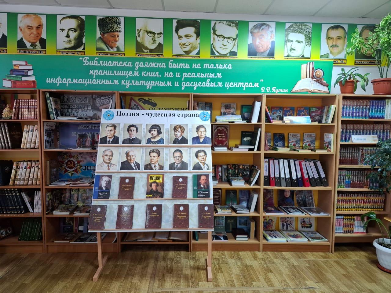 В рамках Всемирного дня поэзии Джабаева М.А., зав.библиотекой в читальном зале для обучающихся школы оформила книжную выставку «Поэзия - чудесная страна».