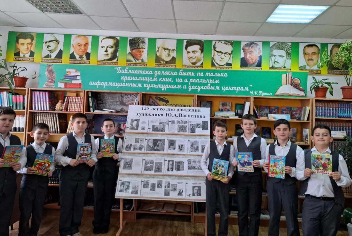 Джабаева М.А., зав.библиотекой провела библиотечный урок для обучающихся 4А класса, посвященный 125- летию со дня рождения художника, живописца и иллюстратора Юрия Алексеевича Васнецова.