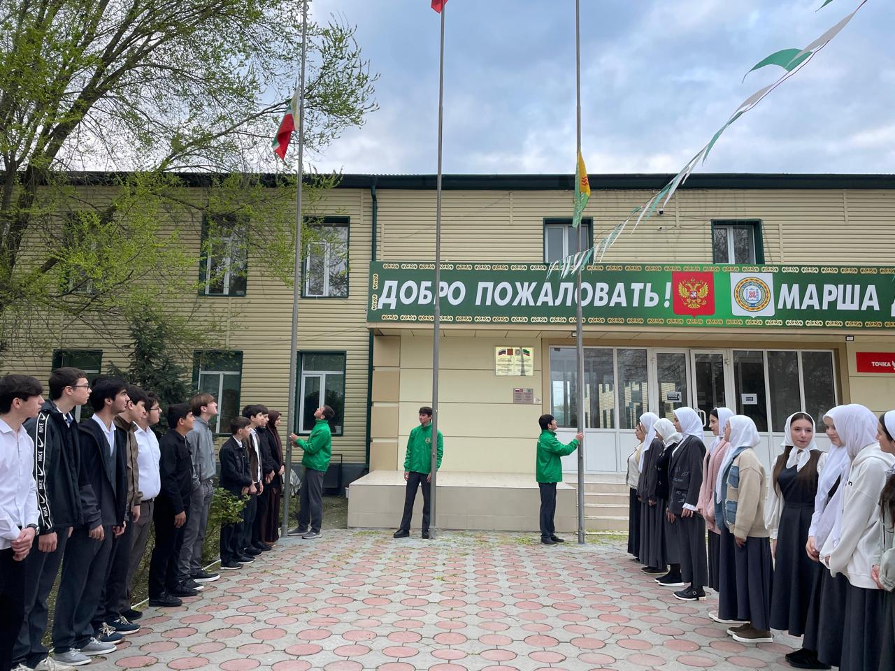 Право поднять государственные флаги было предоставлено активистам ЧРОО ЕДЮО «Юные Кадыровцы».