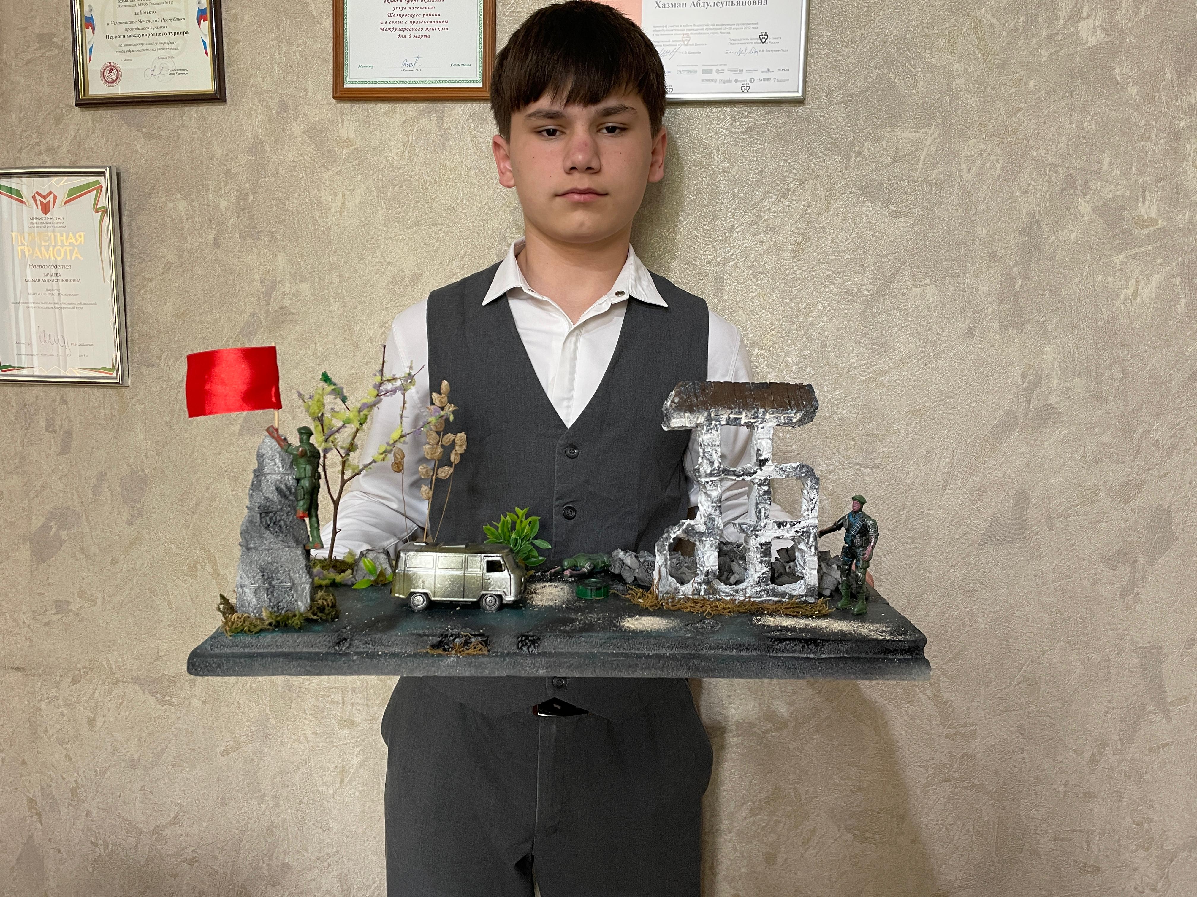 В рамках празднования 80-летия Победы и Года защитника Отечества Кусаев Усман, обучающийся 8Б класса принял участие во Всероссийском конкурсе поделок, организованного Министерством внутренних дел Российской Федерации.