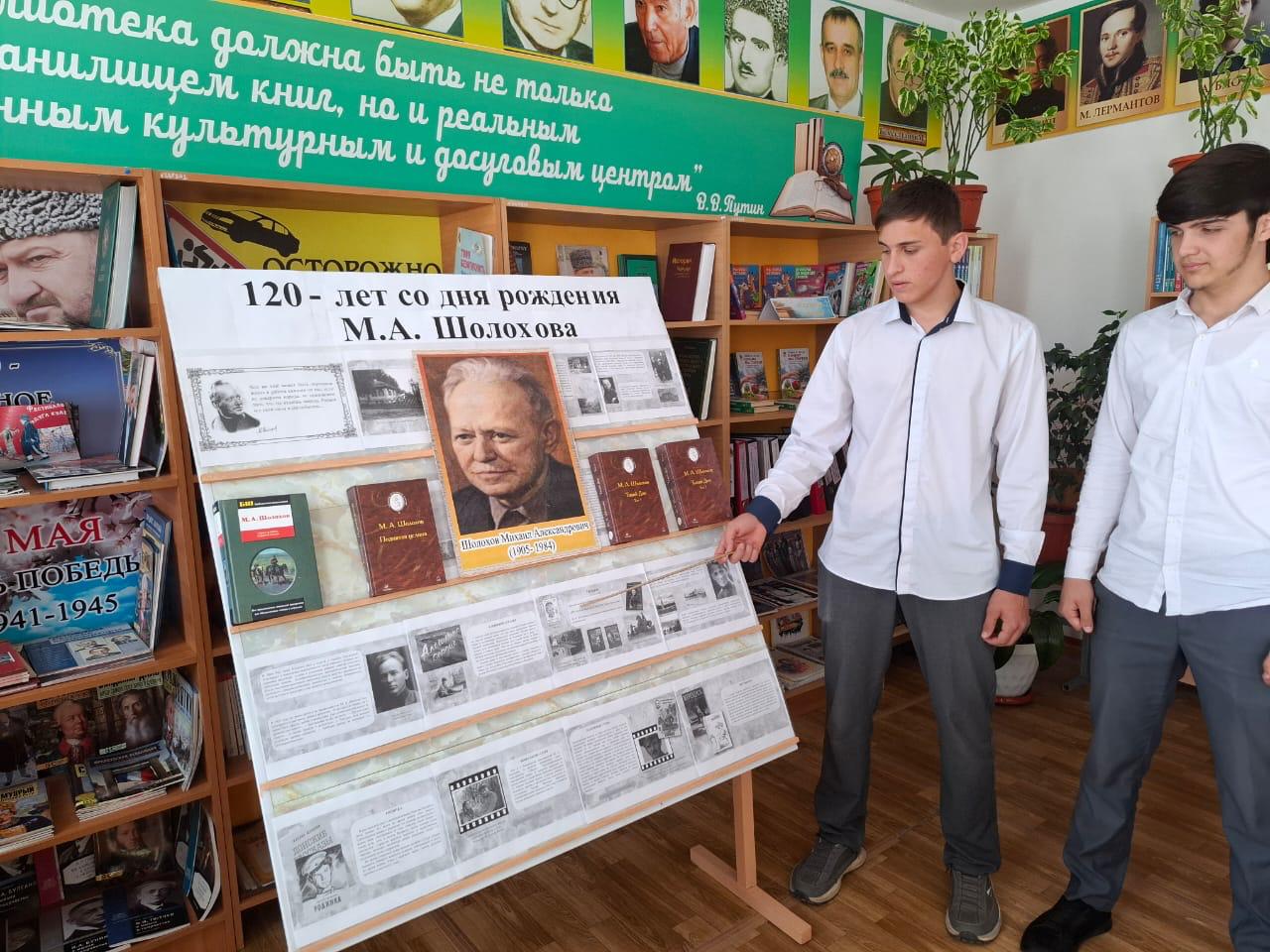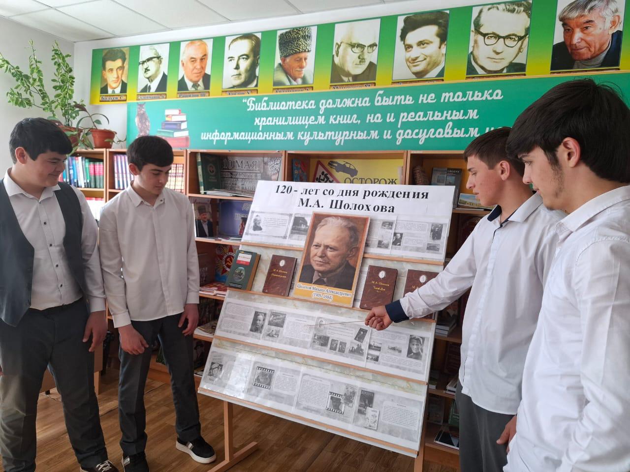К 120 летию со дня рождения русского писателя Михаила Александровича Шолохова, воплотившего в своих произведениях величайшие трагедии XX века и запечатлевшего самобытные картины жизни Донского края в читальном зале МБОУ «СОШ №3 г.Шелковская» Джабаева М.А., зав.библиотекой для читателей оформила тематическую книжную выставку «Читаем Шолохова», на которой представлены произведения писателя, рассказывающие о его жизненном и творческом пути, а также художественные произведения автора: «Тихий Дон», «Поднятая целина», «Судьба человека», «Они сражались за Родину», «Донские рассказы» и другое…