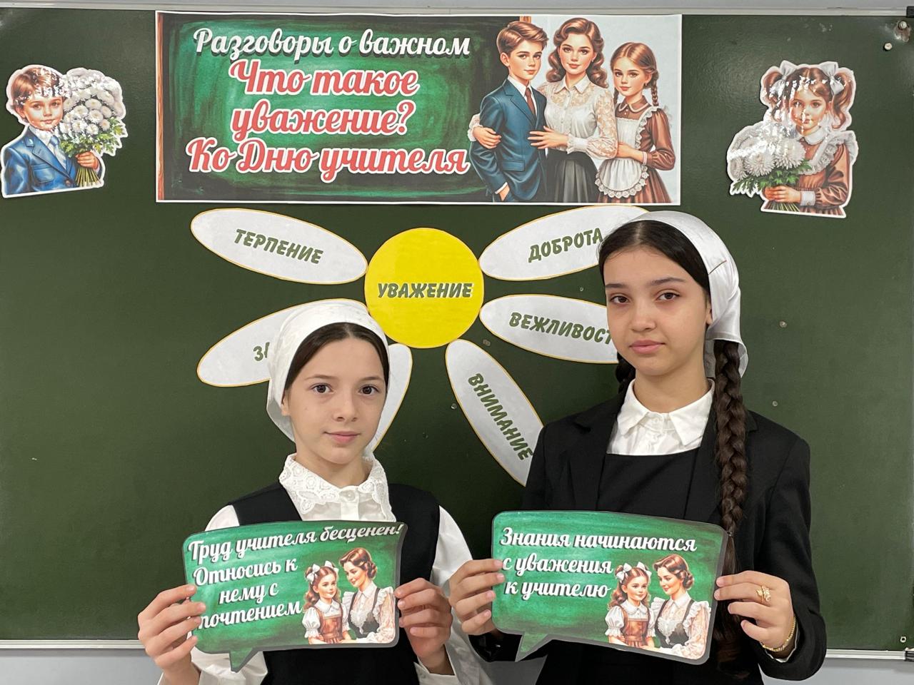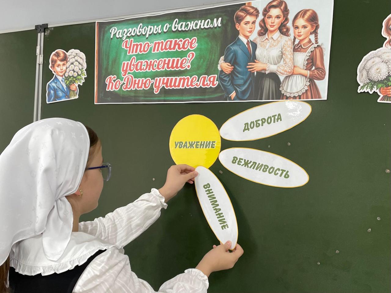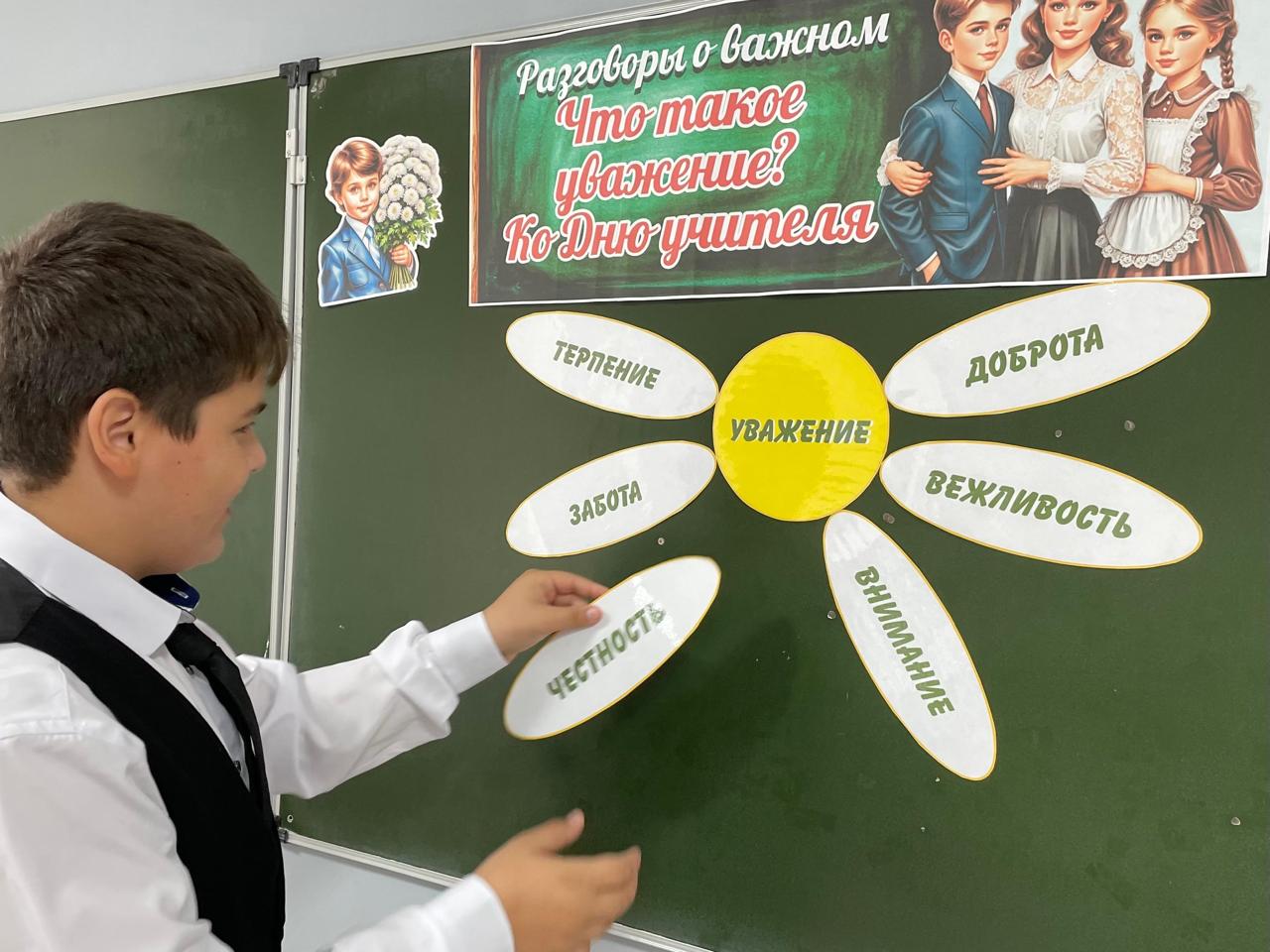После торжественной линейки обучающиеся прошли на внеурочное занятие «Разговоры о важном», тема: «Что такое уважение?», посвящено одному из базовых принципов взаимодействия с людьми. Особое внимание уделено уважению к профессии учителя, а также к труду, окружающим, культуре и природе.