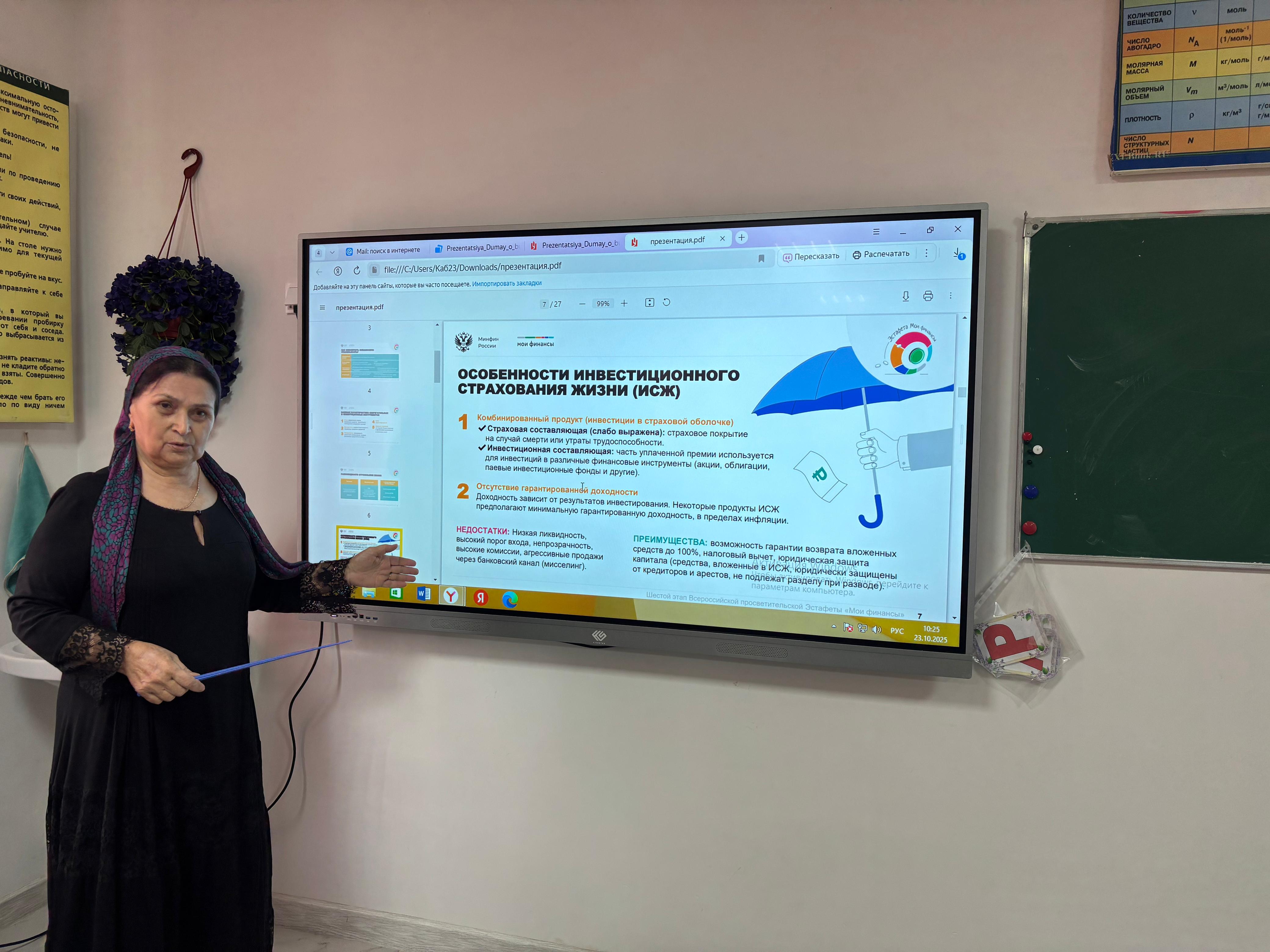 В рамках прохождения шестого этапа Всероссийской просветительской эстафеты " Мои финансы" в 11а, 9а классах зам.директора по МР Мавсаровой С.А, 23 октября проведены мероприятия на тему:"Думай о будущем: страхования и накопления". Целью проведения этих мероприятий является: повышение интереса экономически активных граждан России к тематикам финансовой грамотности, мотивация их к улучшению своего уровня знаний и рационализации поведения.
